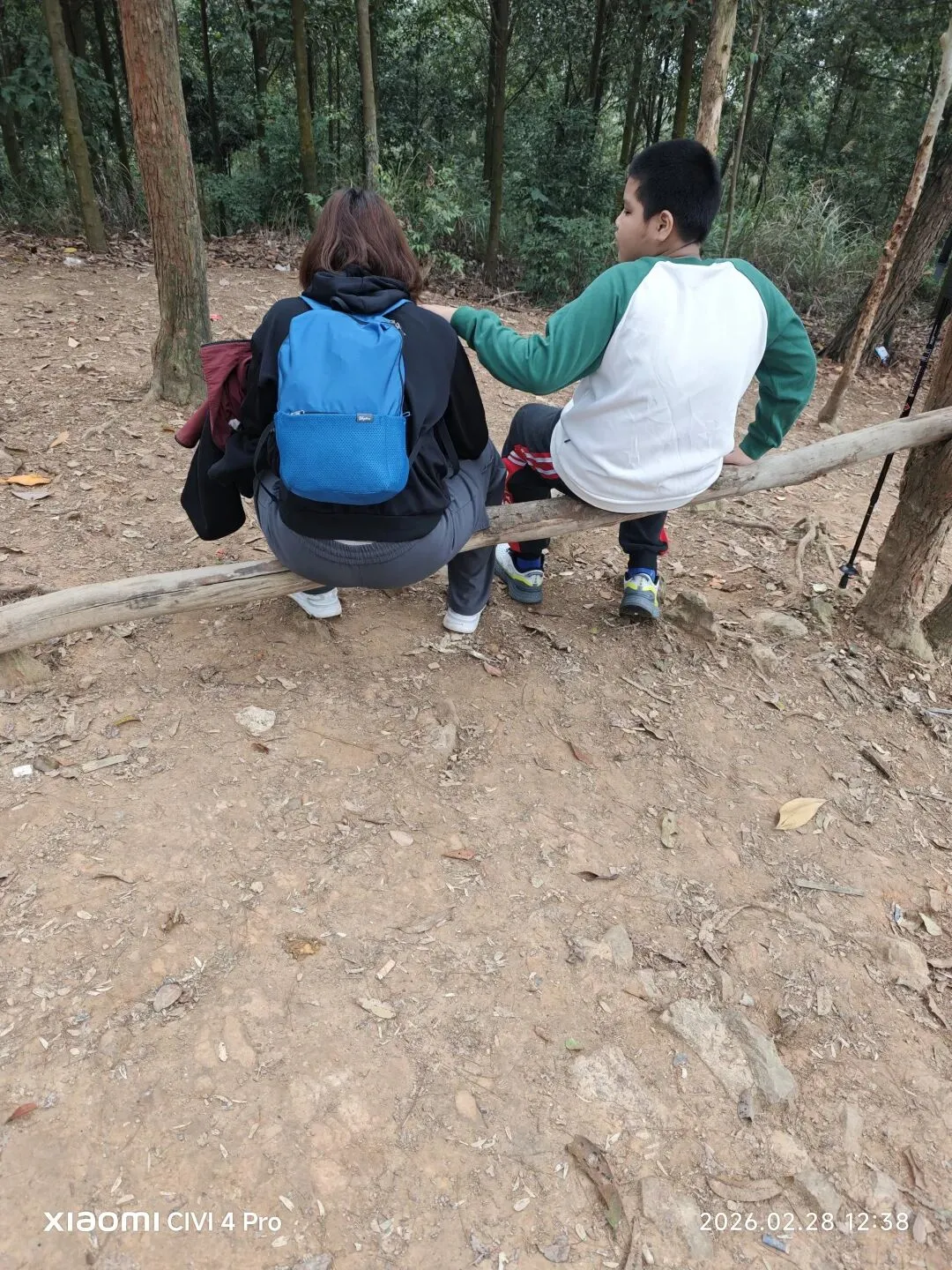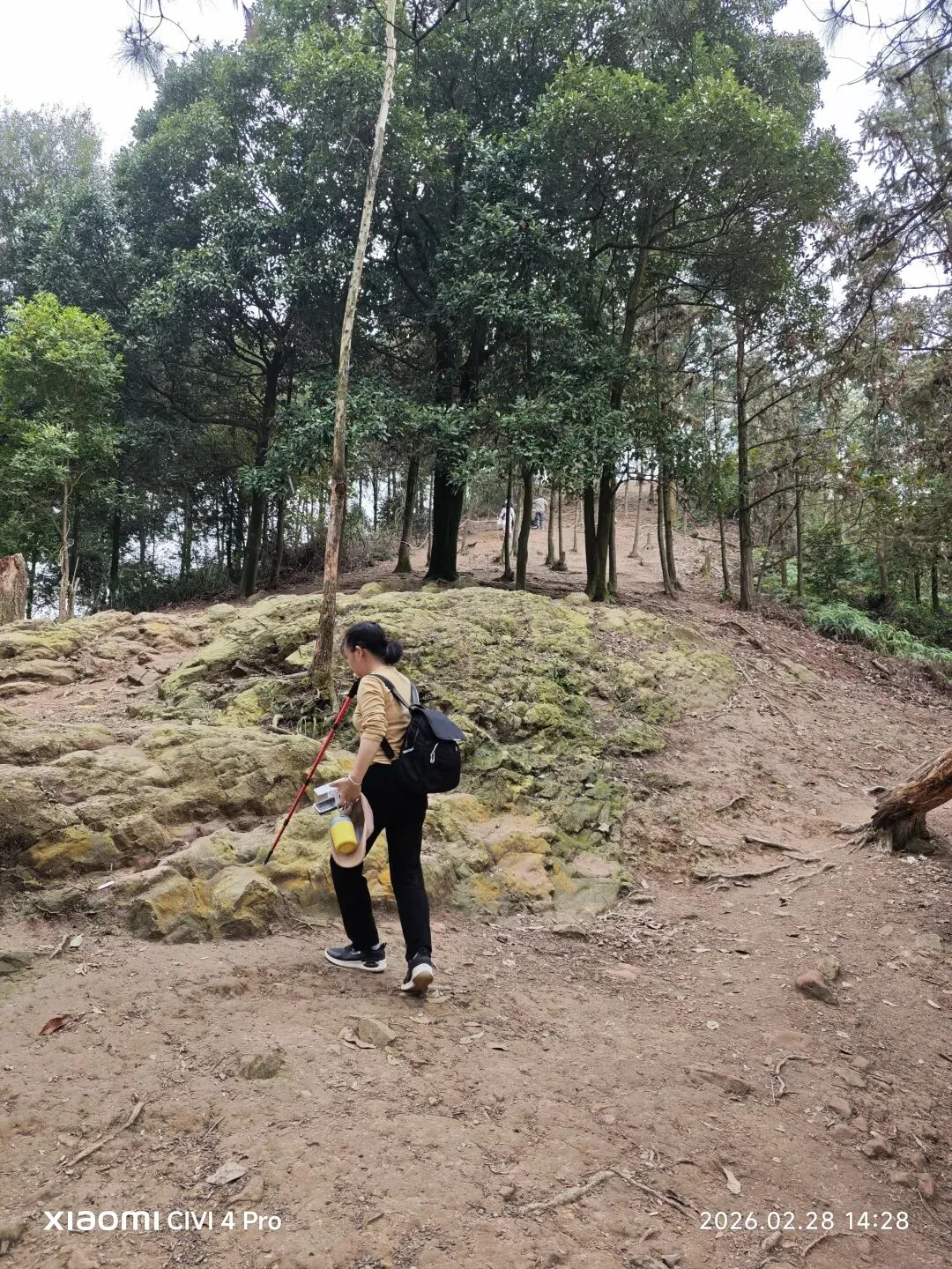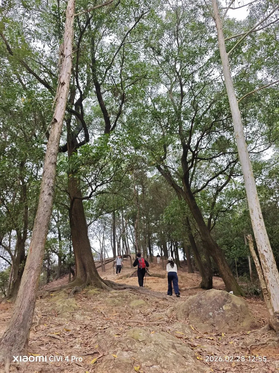 走到第一座山顶,树木遮住视线,只能看见天雹水库部分湖面,半隐半现,水面似乎飘着白白的雾气。一个五岁左右的孩子半跑着冲上山顶,我夸奖他:“小朋友,你真厉害,走得这么远!”“他呀,精力足得很,所以周末都带他来爬山,不然在家总玩手机。”孩子妈妈在旁边笑着回应。 我们继续往前走,见到一片树干笔直的不知名树木,树根大多露在地面,像一张张织网。一位长者坐在一块巨石上休息,我上前打招呼:“师傅,您准备返程了?再往前走是到哪儿?”