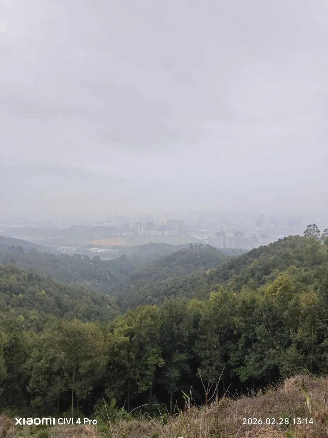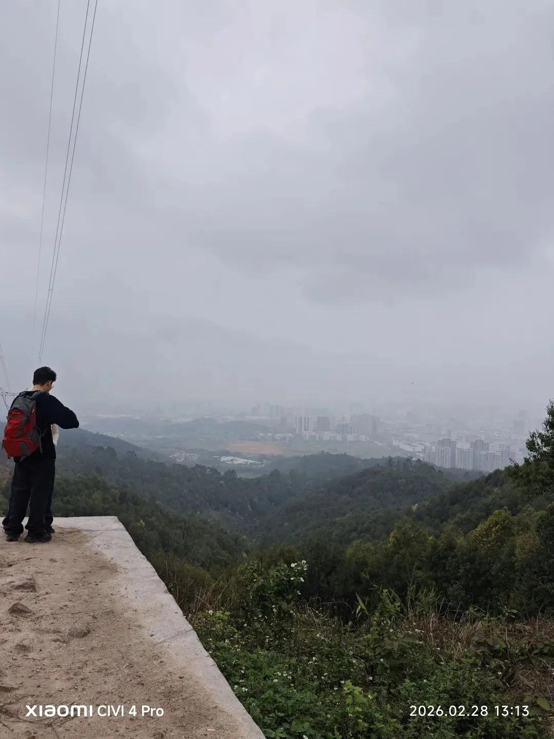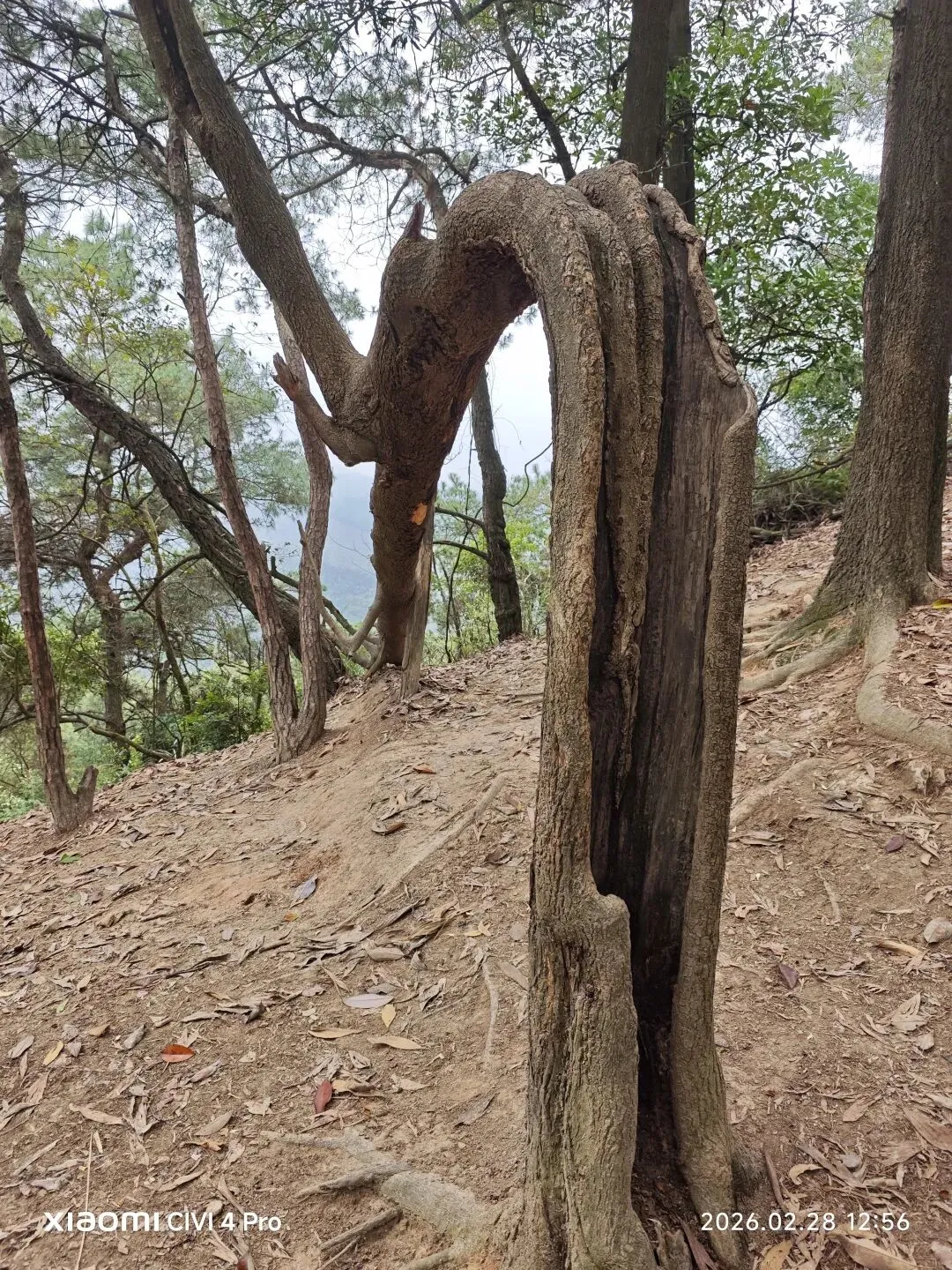 走到第一座山顶,树木遮住视线,只能看见天雹水库部分湖面,半隐半现,水面似乎飘着白白的雾气。一个五岁左右的孩子半跑着冲上山顶,我夸奖他:“小朋友,你真厉害,走得这么远!”“他呀,精力足得很,所以周末都带他来爬山,不然在家总玩手机。”孩子妈妈在旁边笑着回应。 我们继续往前走,见到一片树干笔直的不知名树木,树根大多露在地面,像一张张织网。一位长者坐在一块巨石上休息,我上前打招呼:“师傅,您准备返程了?再往前走是到哪儿?”