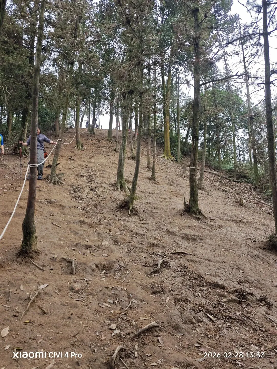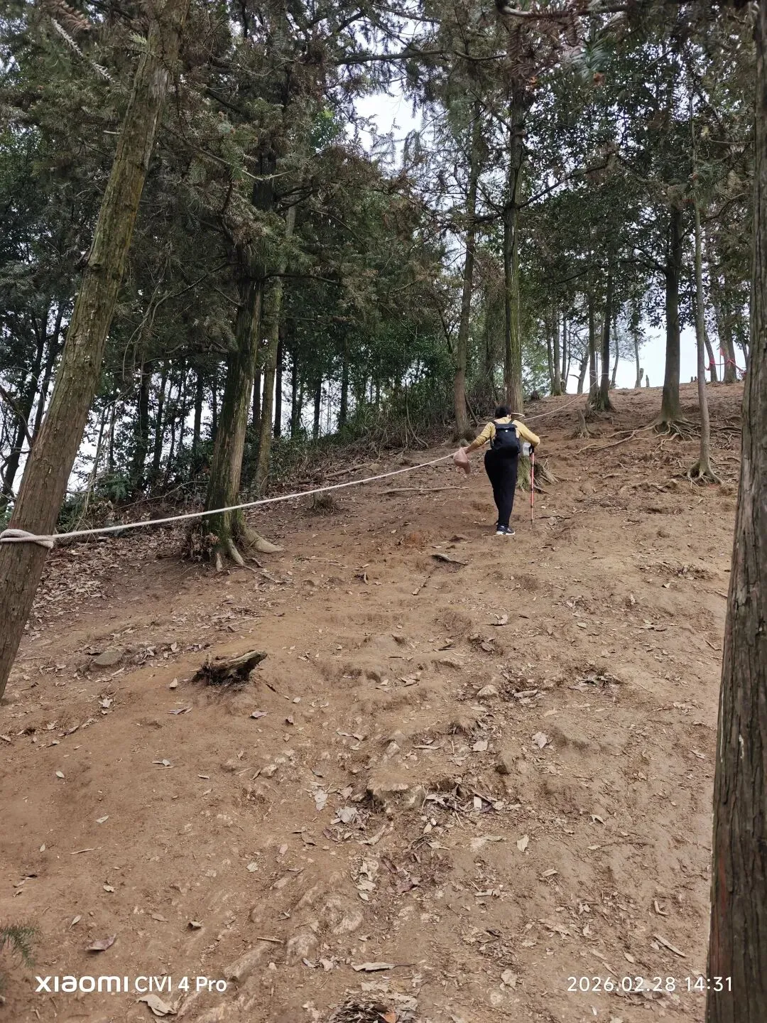 第二座山比第一座山更陡峭,驴友们为了安全,用绳子把从山底到山顶的树木连起来,打成一排,游客上下山时扶着绳子,才不容易滑倒。