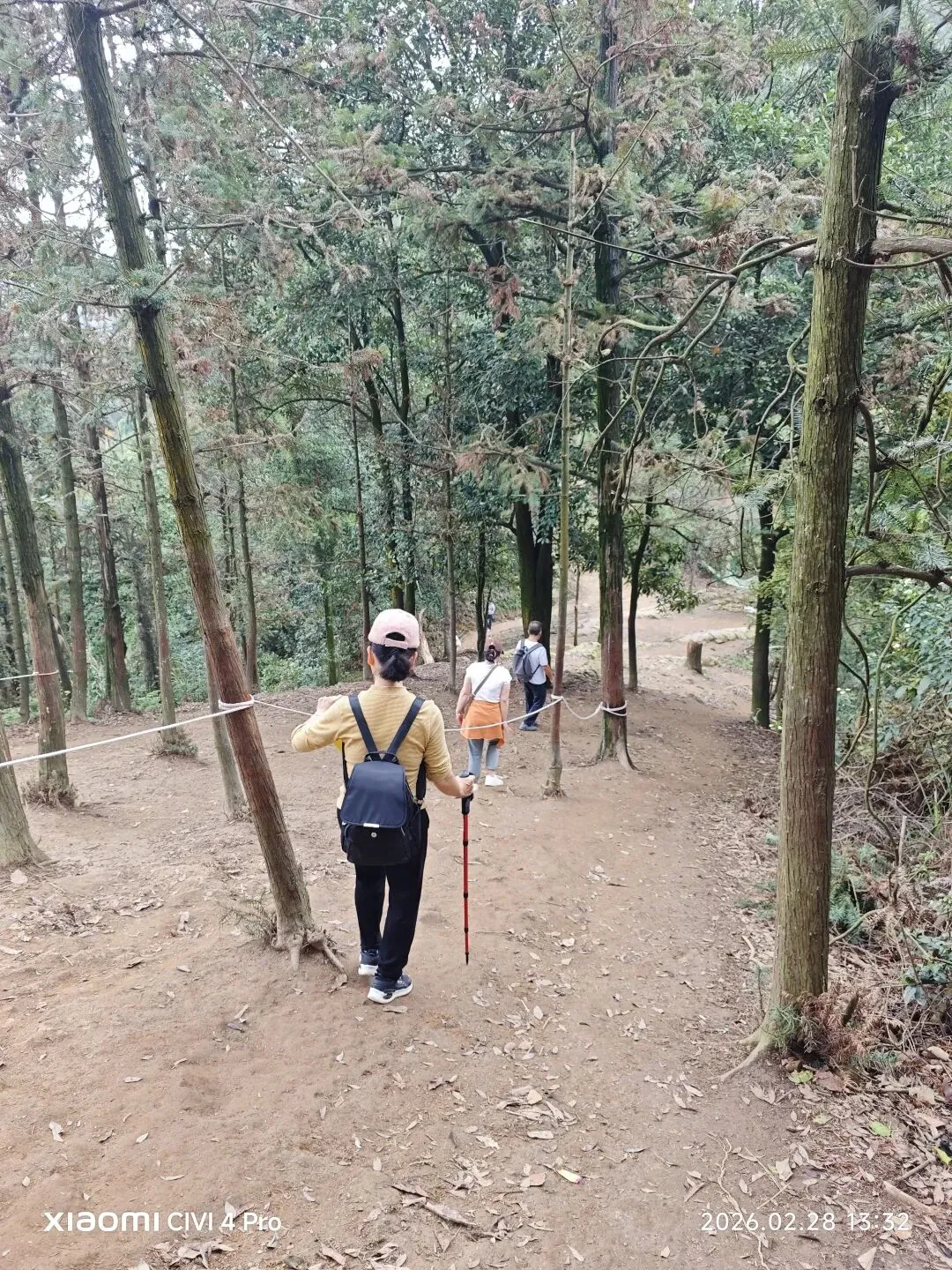 山脚是一条狭窄、绕山盘旋向上的泥巴路。我们上午十点半上山,走在林木茂盛的山路上,不时遇见三两结伴的爬山爱好者。他们或是有说有笑迎面下山,或是低头拄着登山杖,脚步稳健地走在我们前面。