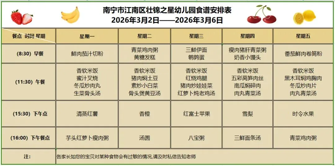 2026年春季学期南宁市江南区壮锦之星幼儿园第一周食谱公示