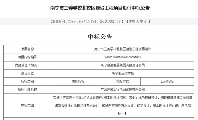 2026年2月27日,南宁有关部门发布信息,学校新建设的北校区,设计单位敲定,为华蓝设计(集团)有限公司。