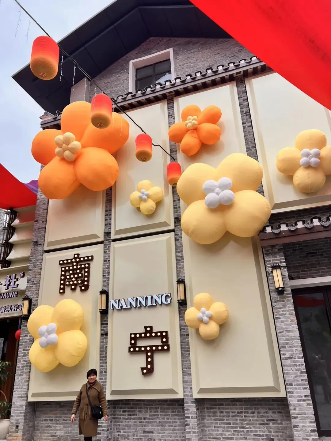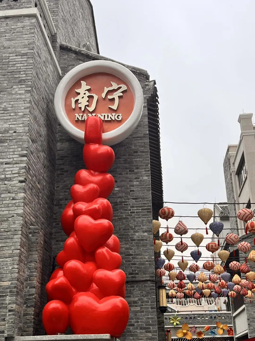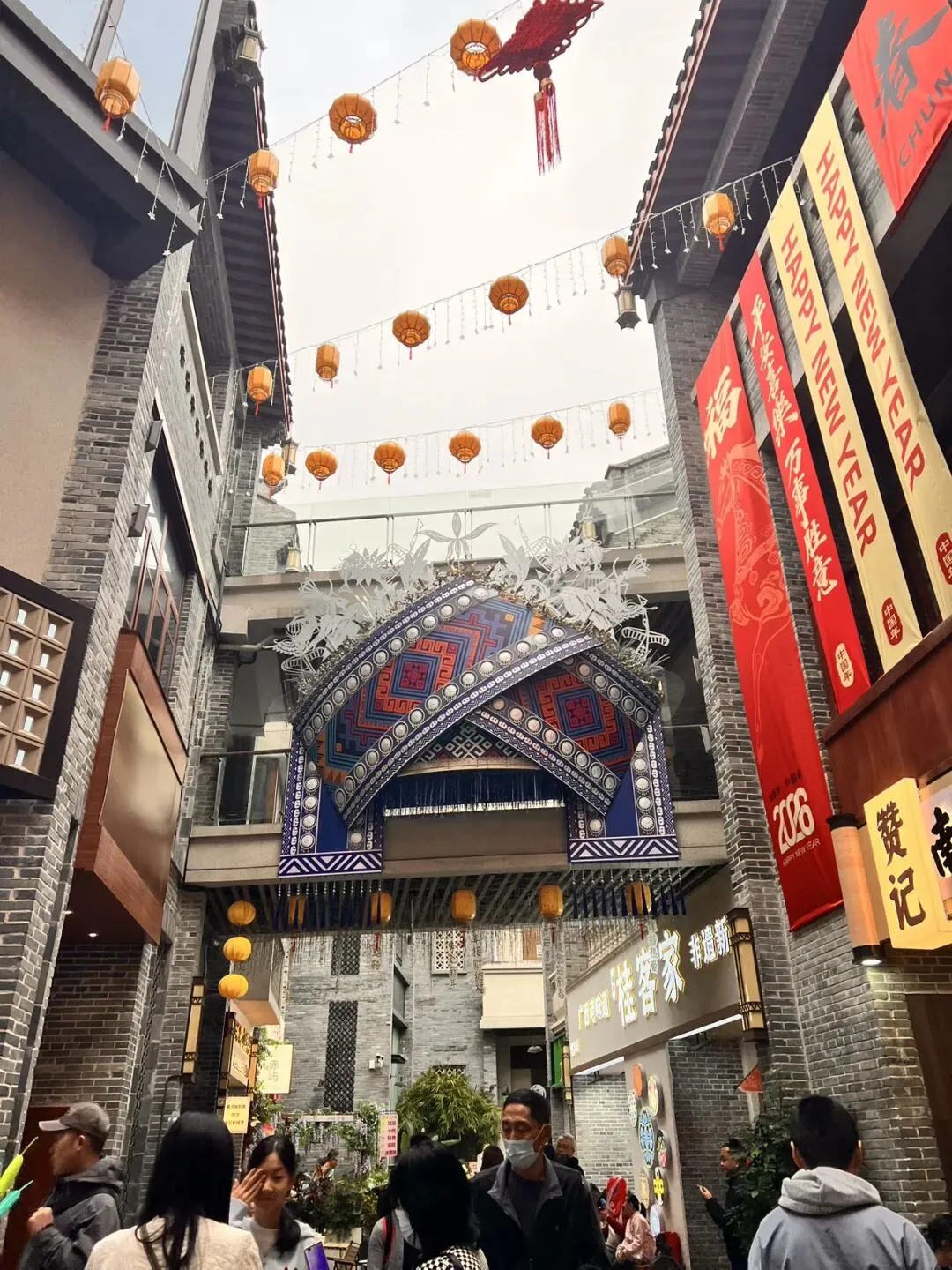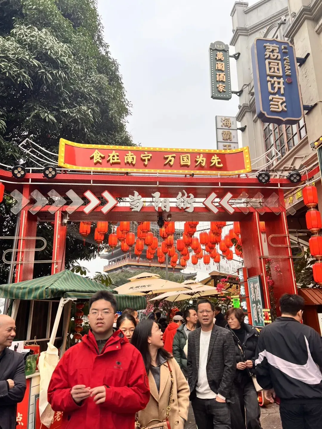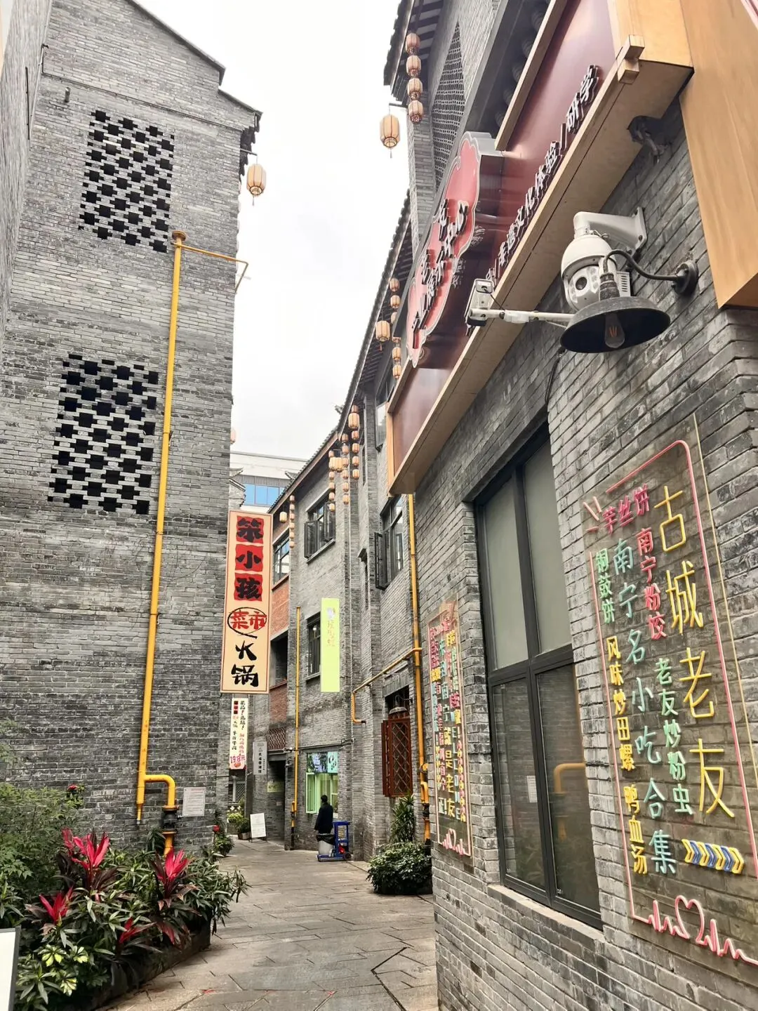 就是在这个可爱的小老头儿这儿买的,不知道他说的是不是南宁话,有点好听,也有点好玩。 对了,差点忘了,广西还有一种东西很好吃,叫油茶,我们是在瑶王府吃的,应该比较正宗吧。黄澄澄的油茶,拌上各种佐料,不能太淡,不然味道会很怪,加点盐就非常好喝了,我们一家四口喝完了一满盆😀。广西的美食挺多,而且不贵,即使在景区也算良心价。 初三上午女儿身体还不算爽利,儿子也留在酒店赶作业,孙同学陪着他们,我一个人去了三街两巷。三街两巷是南宁有名的历史文化街区,由兴宁路、民生路、解放路三条步行街及金狮巷、银狮巷两条古巷组成,整体范围挺大的,查了下资料,核心区域占地约150亩,建筑面积超30万平方米。但由于核心区与周边新建商业街区、老城区的新旧建筑融合的非常好,所以实际给人的感觉要大的多。三街两巷是南宁历史文化的发源地,核心街区始建于宋代,为古邕州繁华之地,南宁城即是在此基础上发展起来的,里面有多老建筑,见证了南宁历史文化的变迁。三街两巷包含了城隍庙、邓颖超纪念馆、南宁建制博物馆、中华大戏院等二十多处文物及历史建筑,整体色彩为青砖黛瓦,多为骑楼建筑,很有岭南之韵,部分建筑融入了西方元素,有种即古老又时尚的时空交错感,这也是三街两巷明显区别于我看过的其他城市老街区,如成都宽窄巷子、重庆磁器口等。 春节期间有灯会,白天免费,五点以后进去要收费,包括邕江边上打铁花表演,用个围挡圈起来收费,给我逗笑了。文旅部门格局小了,可以向我老家河南文旅学学,但别学云南,虽然我就在云南,但云南文旅只能说命好,靠天吃饭。 三街两巷紧挨邕江,可以体验邕江夜游,但我们时间没赶巧。