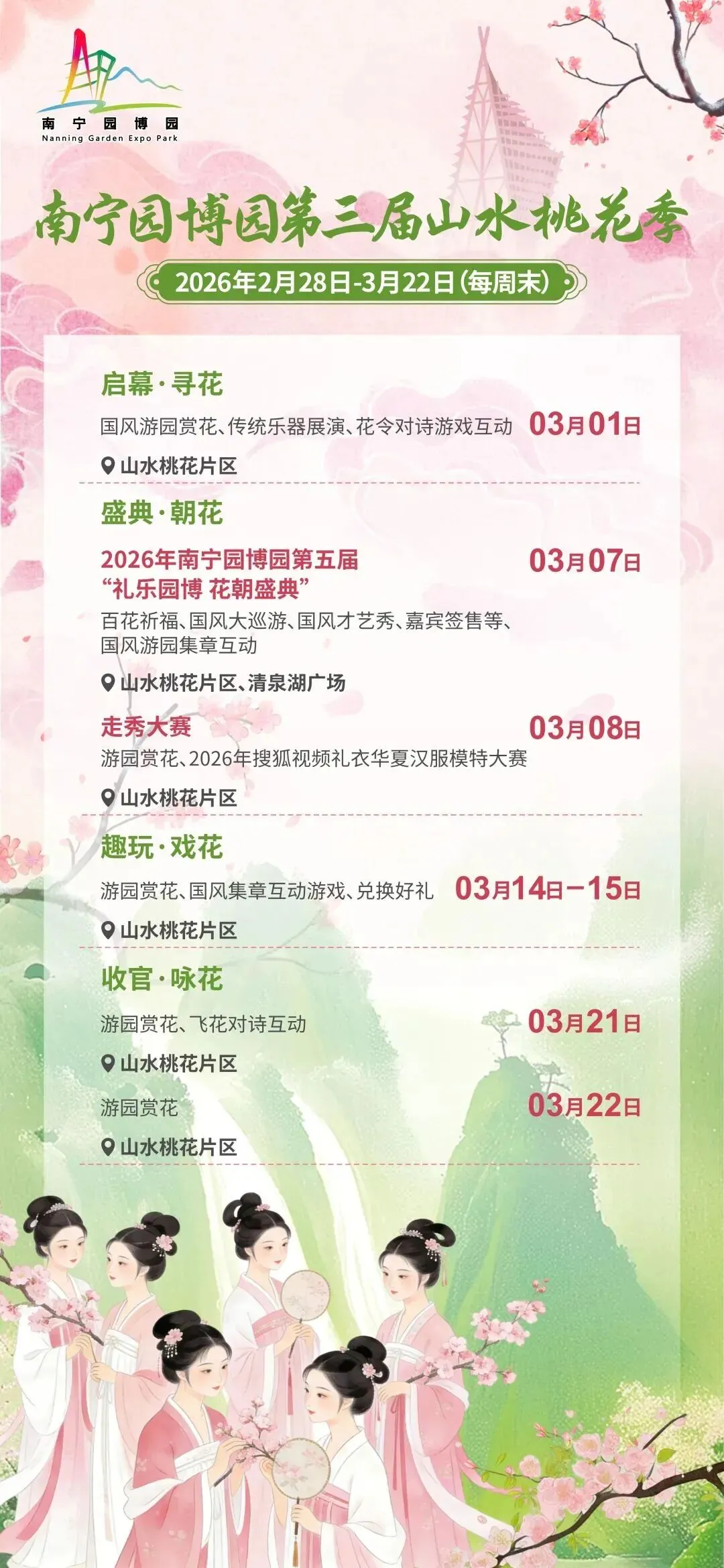 当南宁的春风轻拂,似一双温柔的手,唤醒了沉睡一冬的大地,万物在煦暖中欣然复苏。2026年2月28日至3月22日,南宁园博园宛如一位盛装待嫁的佳人,第三届山水桃花季如约翩然而至,恰似一场与春天的浪漫约定。与此同时,3月7日,第五届“礼乐园博花朝盛典”也将盛大启幕,一系列丰富多彩的国风文化活动,宛如一幅徐徐展开的春日画卷,为游客呈上一场美轮美奂的文旅盛宴。