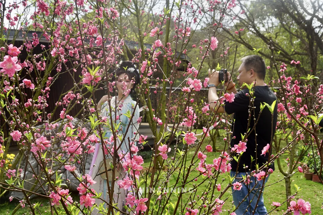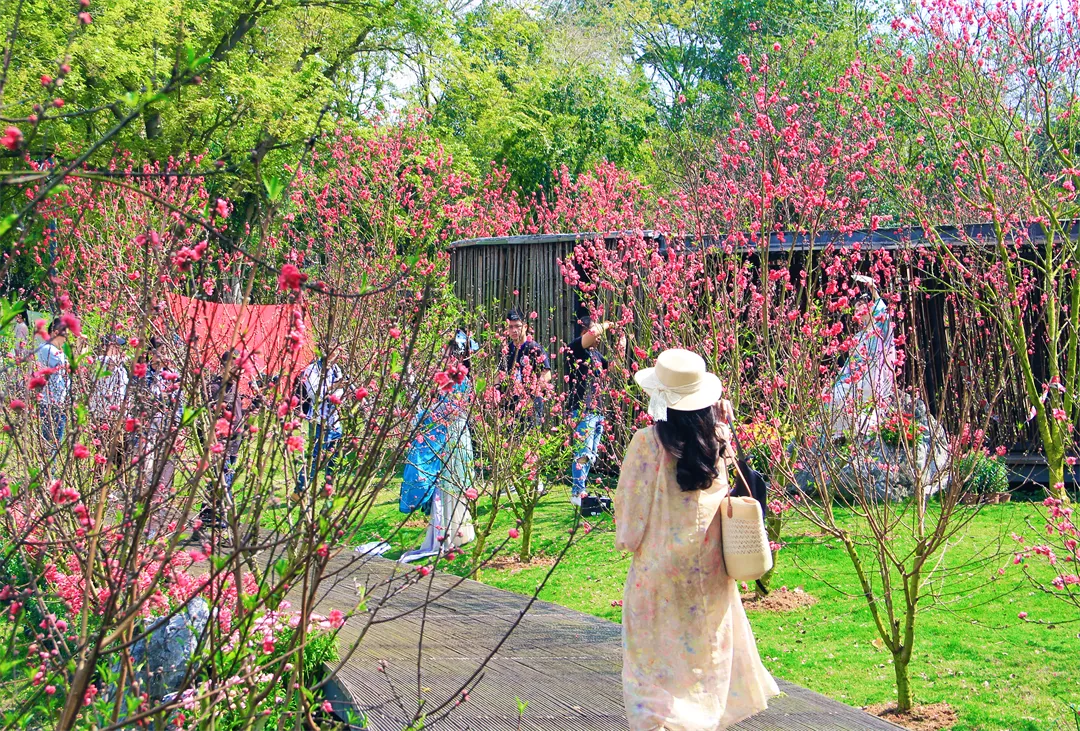 尤为值得一提的是,桃花景观与周边的昆山园、苏州园、南京园、重庆园等城市展园完美融合。江南园林的精致典雅,在桃花的点缀下更显韵味无穷。游客们穿梭于展园之间,既能品味园林的精巧布局和独特韵味,又能感受这如诗如画的意境,随手一拍,便是一张美轮美奂的春日大片,定格下这美好的瞬间。