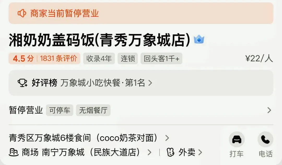 搜了一下其它地方还有3家店正常营业,只不过在万象城这里吃不到了,但是也可以点外卖的,习惯了堂食有点不适应而已……