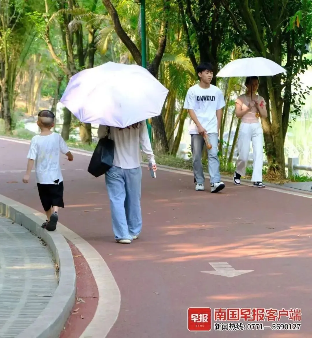 ▲4月27日下午,南宁市民撑伞遮阳。南国早报全媒体记者 尹世斌摄