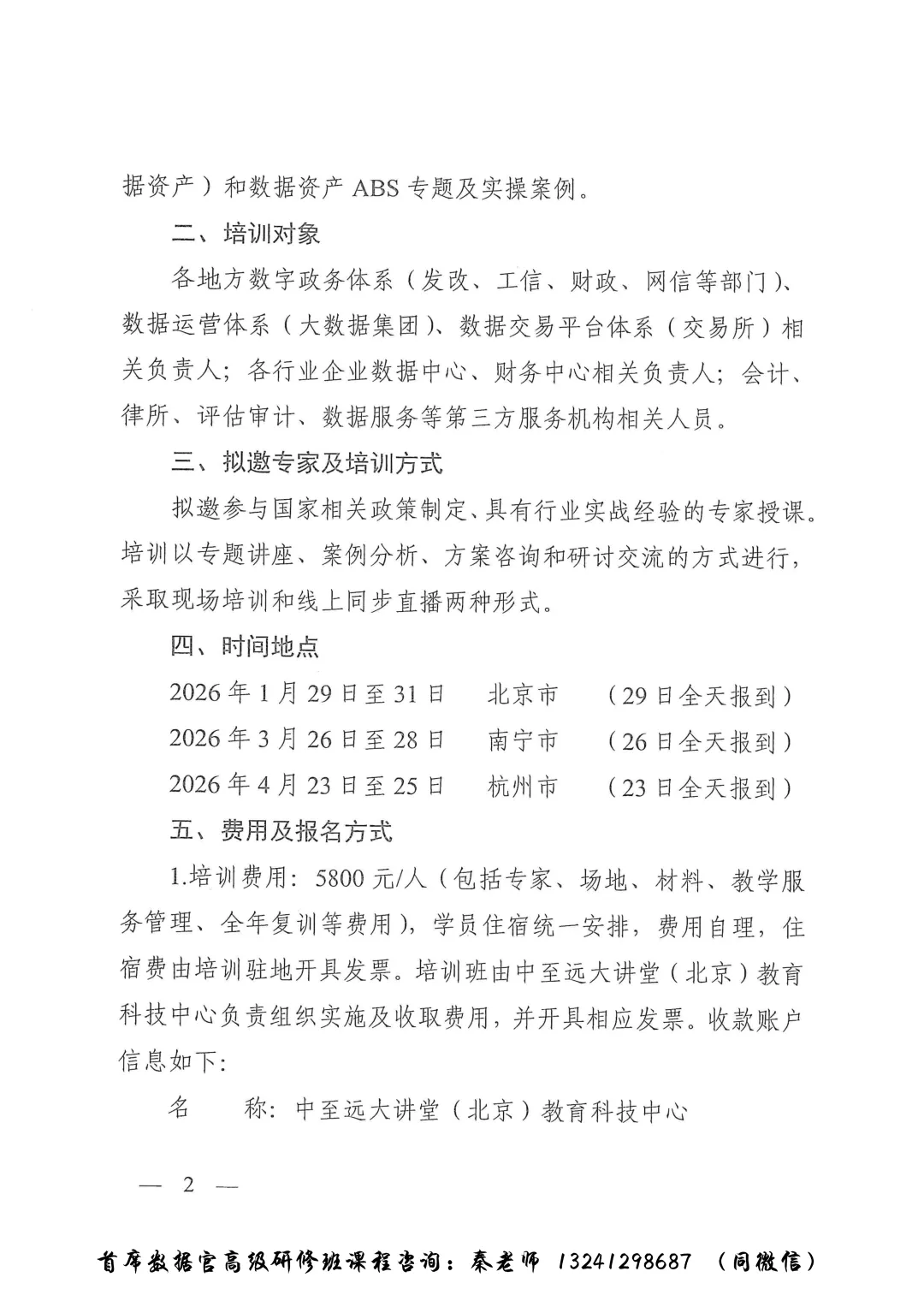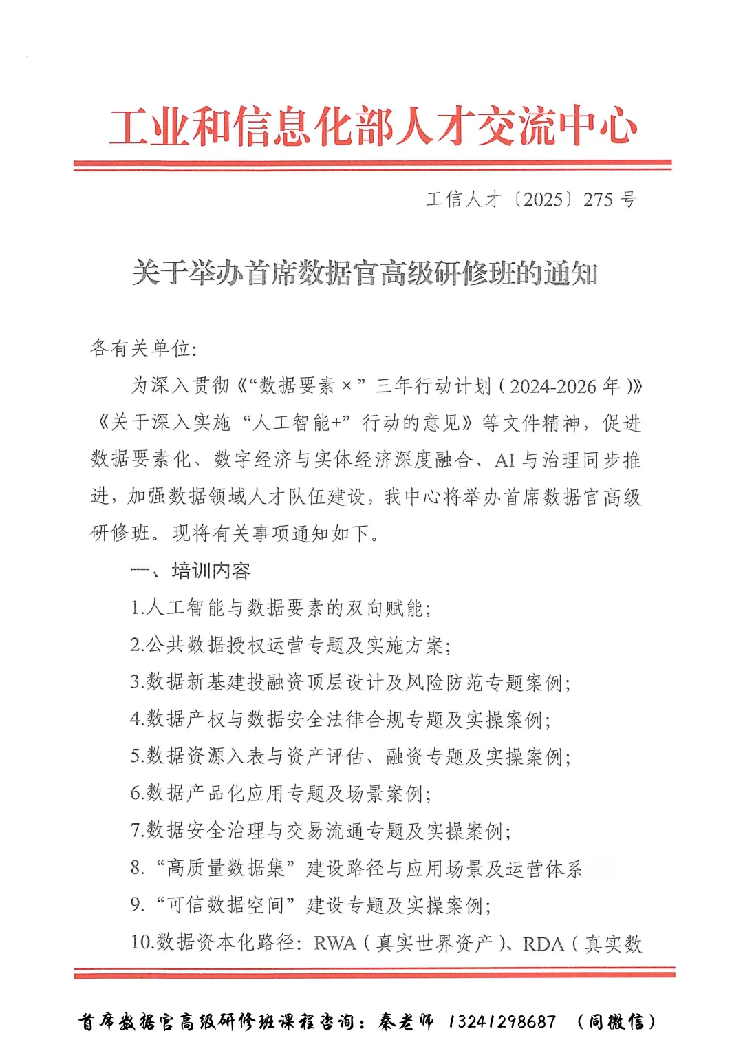 为深入贯彻数据要素三年行动计划(2024-2026)《关于加快公共数据资源开发利用的意见》《政务数据共享条例》等文件精神,促进数据要素有序流通,高效配置,加强数据领域人才队伍建设,我中心将举办首席数据官高级研修班,针对全国招生,每月一期,授课方式两种:线上网络视频+现场学习交流,如需了解详细资料请联系秦老师13241298687同微信。