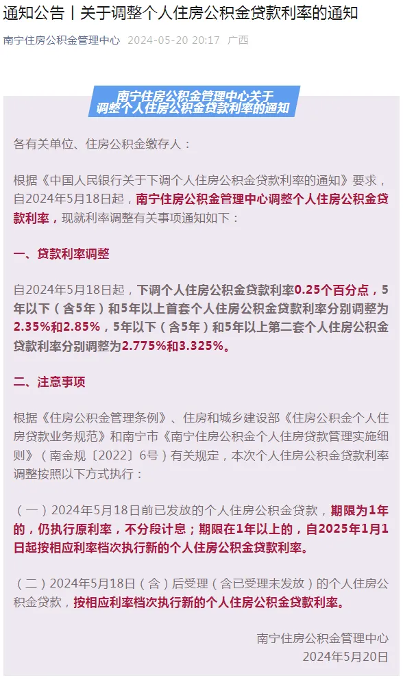 此前,《中国人民银行关于下调个人住房公积金贷款利率的通知》出台。5月20日,南宁住房公积金管理中心就利率调整有关事项落地。