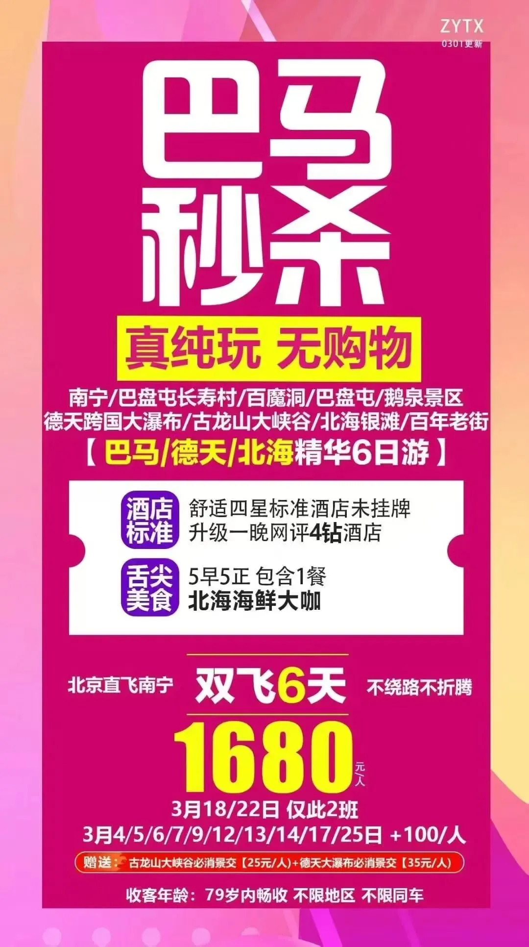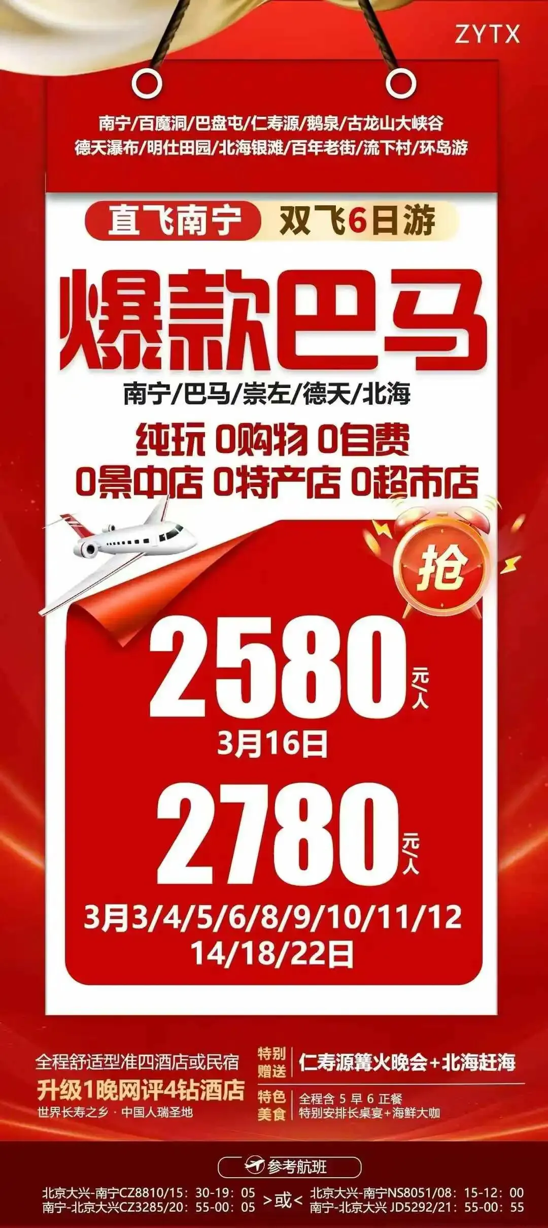 [庆祝]3月16日爆款巴马 双飞六立减300元/人