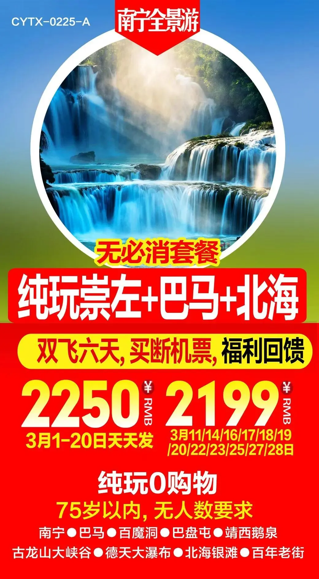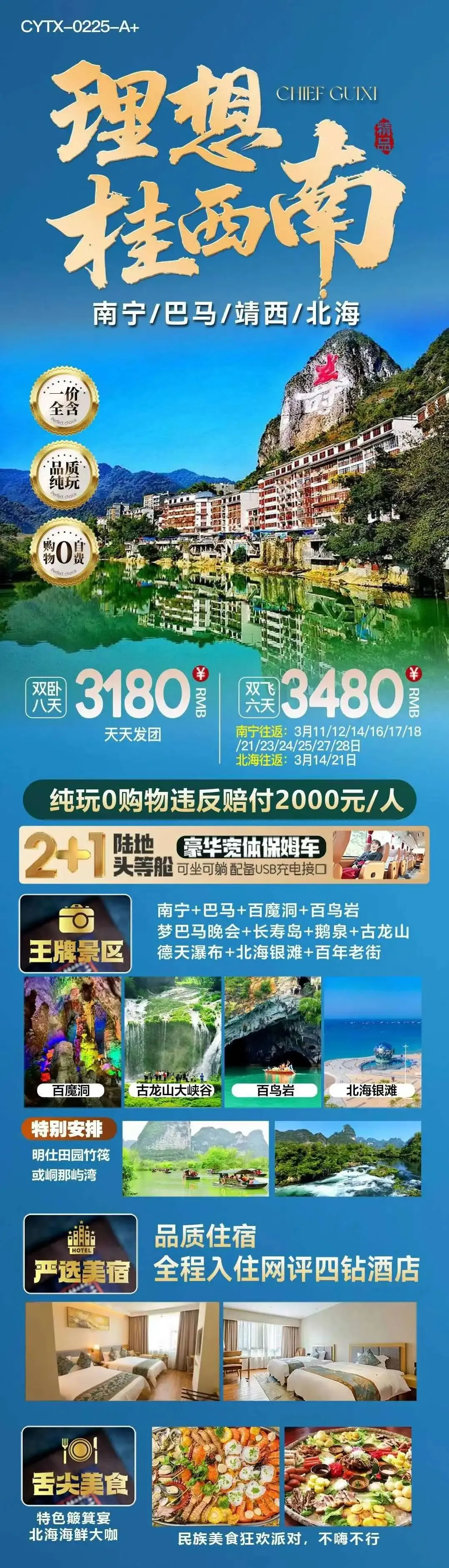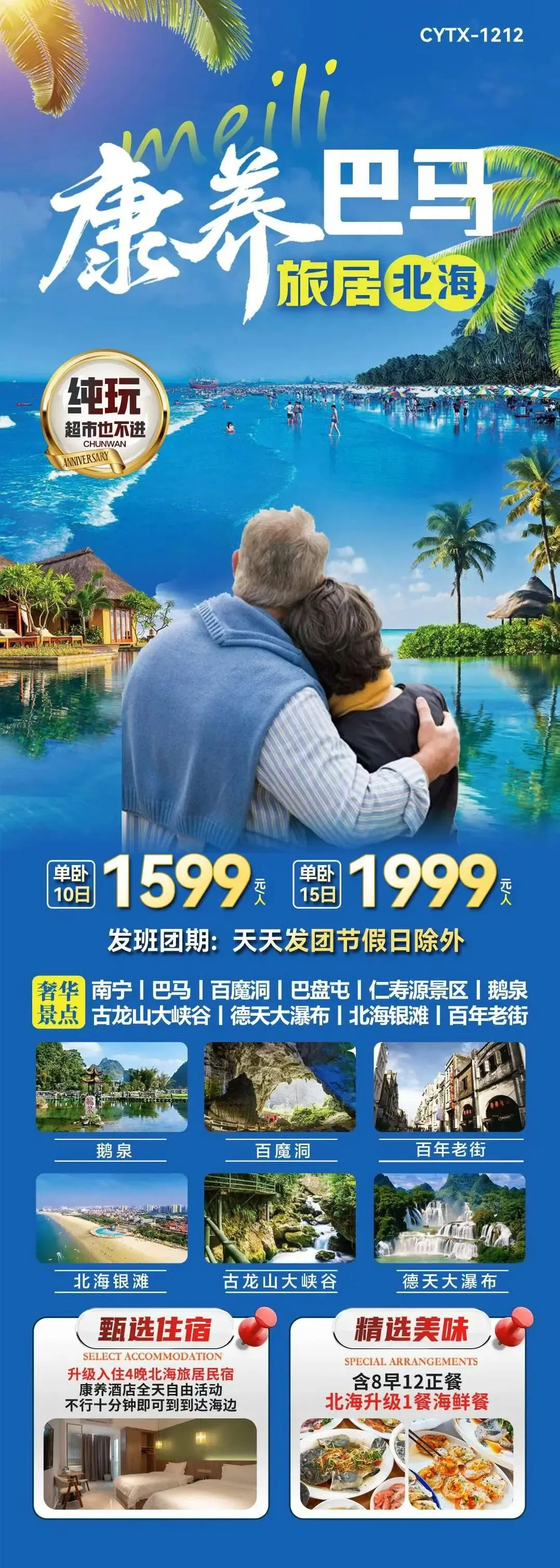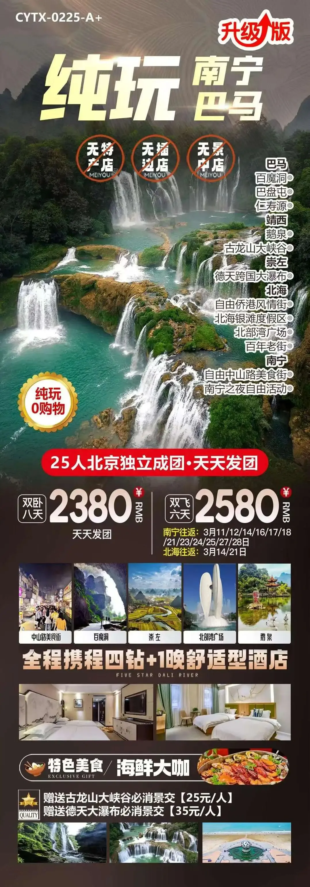 🔥南宁/巴马/长寿村/百魔洞/仁寿源/巴盘屯/鹅泉/德天大瀑布/古龙山峡谷/北海银滩/百年老街
