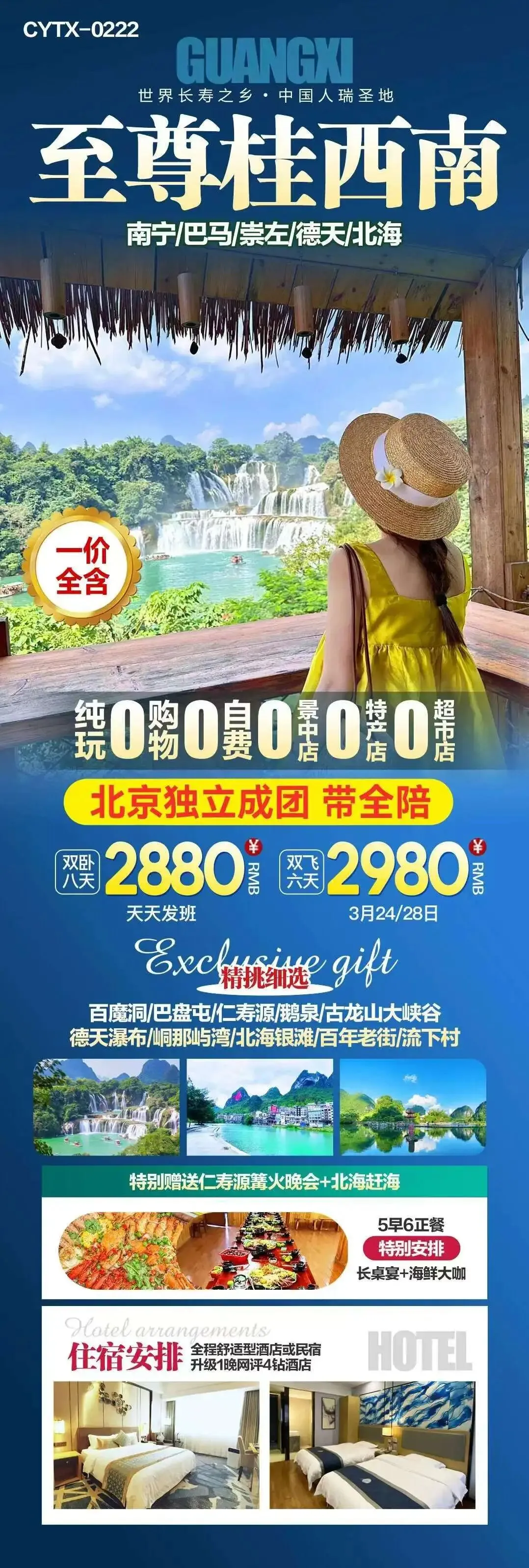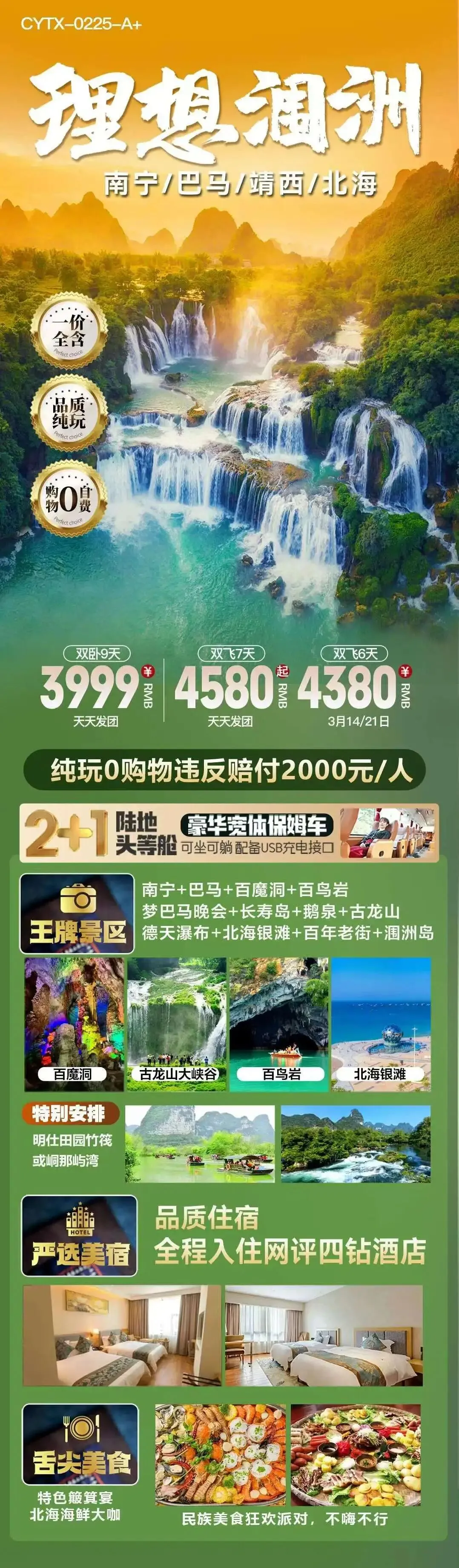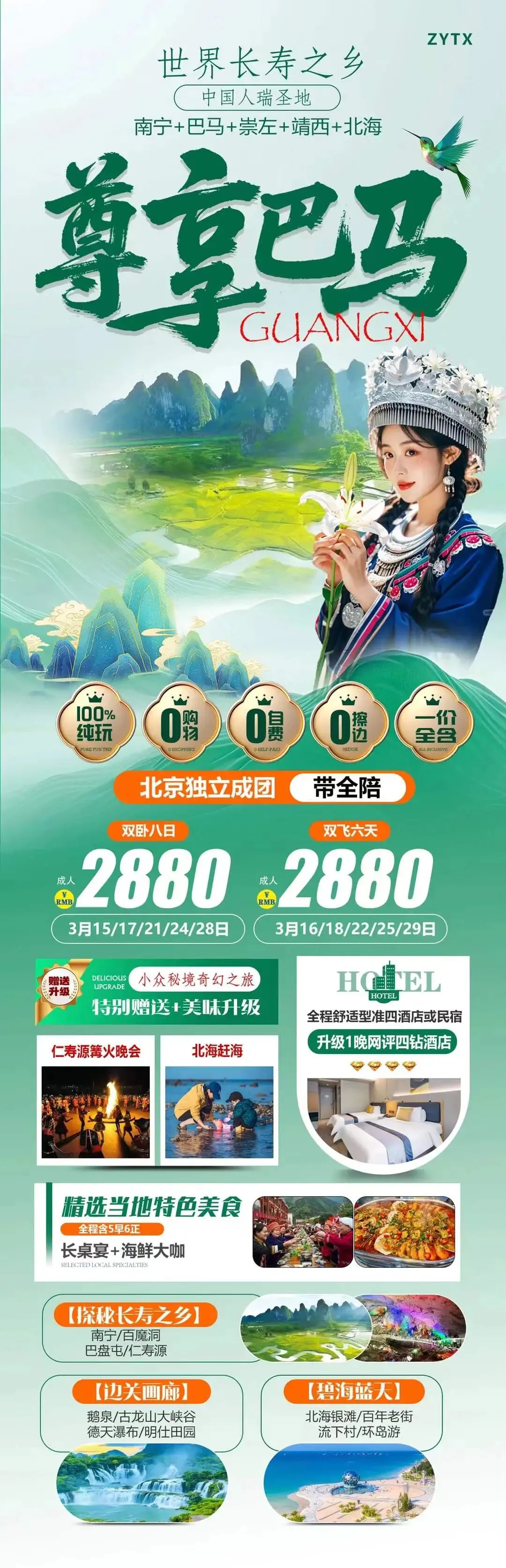 🔥南宁/巴马/长寿村/百魔洞/仁寿源/巴盘屯/鹅泉/德天大瀑布/古龙山峡谷/明仕田园/北海银滩/百年老街/网红渔下村/赶海