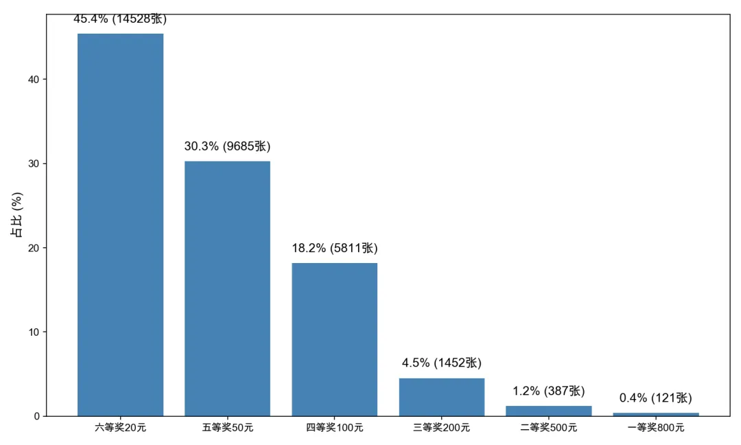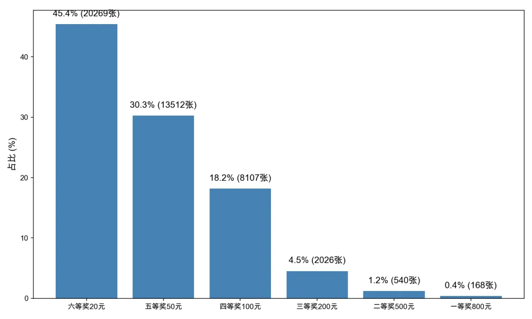 三等奖占比约 4.5%,二等奖约 1.2%,一等奖仅约 0.4%。