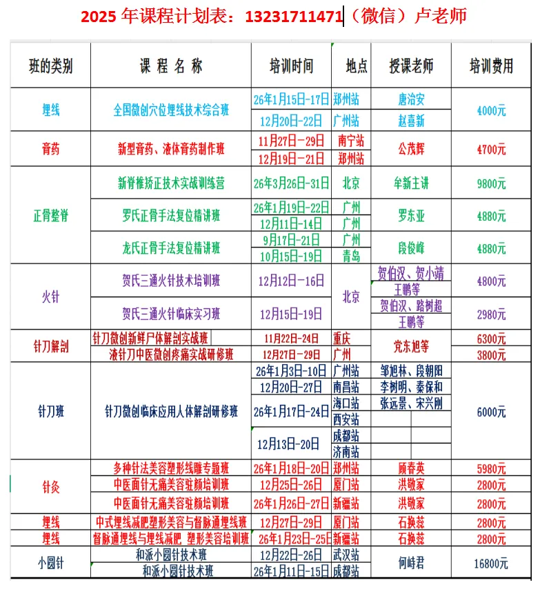 第一天 | 09:10-11:50 | 1.锤击整脊埋线治疗颈椎病、腰椎病、各种心脏病、顽固性疼痛、坐骨神经痛、三叉神经痛、带状疱疹后遗神经痛等; 2.鼻粘膜麻醉埋线减痛技术; |