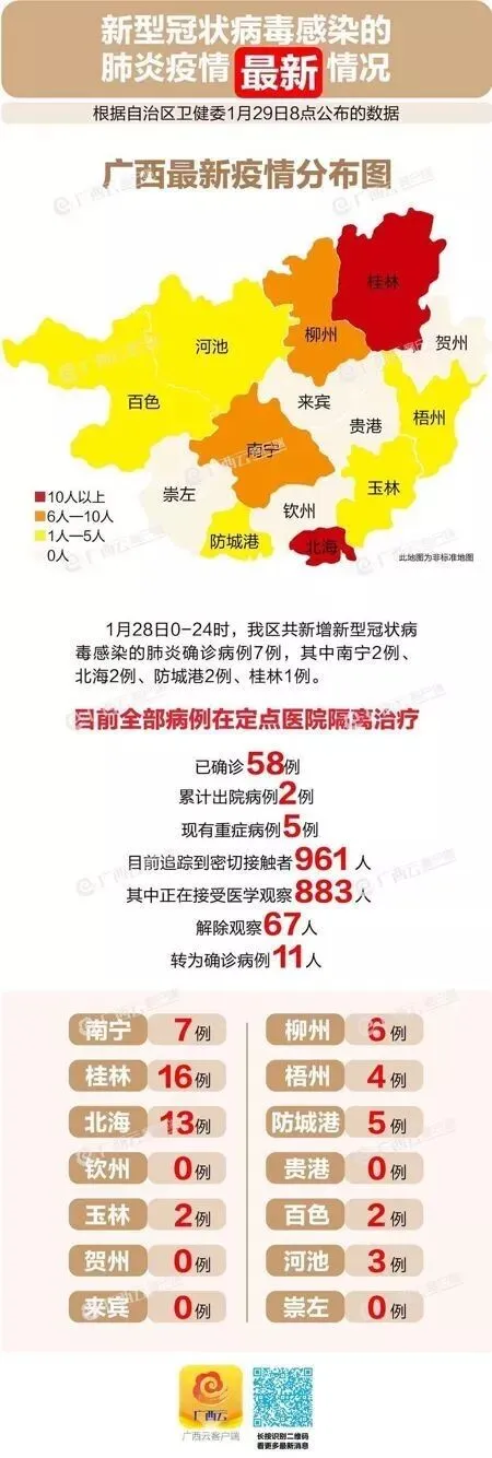 1月28日0-24时,我区共新增新型冠状病毒感染的肺炎确诊病例7例,其中南宁2例、北海2例、防城港2例、桂林1例。