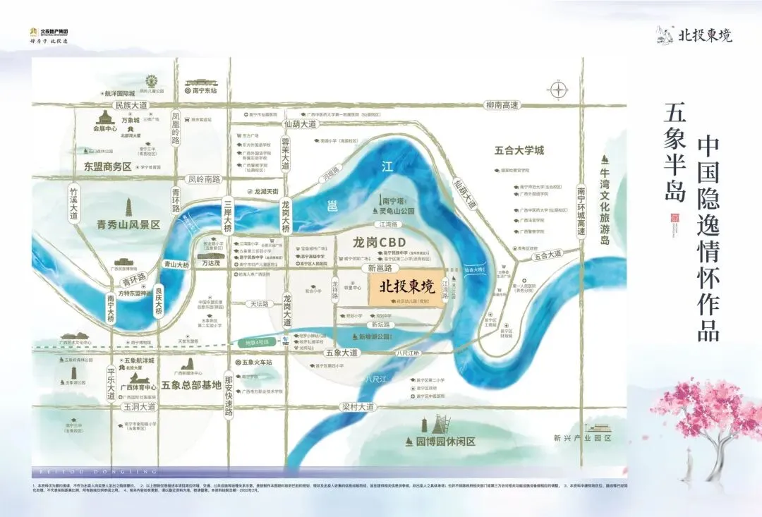 交通优势:北投东境紧邻江湾路,坐拥完善交通配套,接轨新邕路、龙岗大道、五象大道等主干道,快速畅达全城。同时链接7座跨江大桥:龙岗大桥、青山大桥、三岸大桥、良庆大桥、蒲庙大桥均已建成通车,青坪大桥、仙合大桥正在规划中,大型交通枢纽五象火车站(规划)落位龙岗,交通日益升级完善。