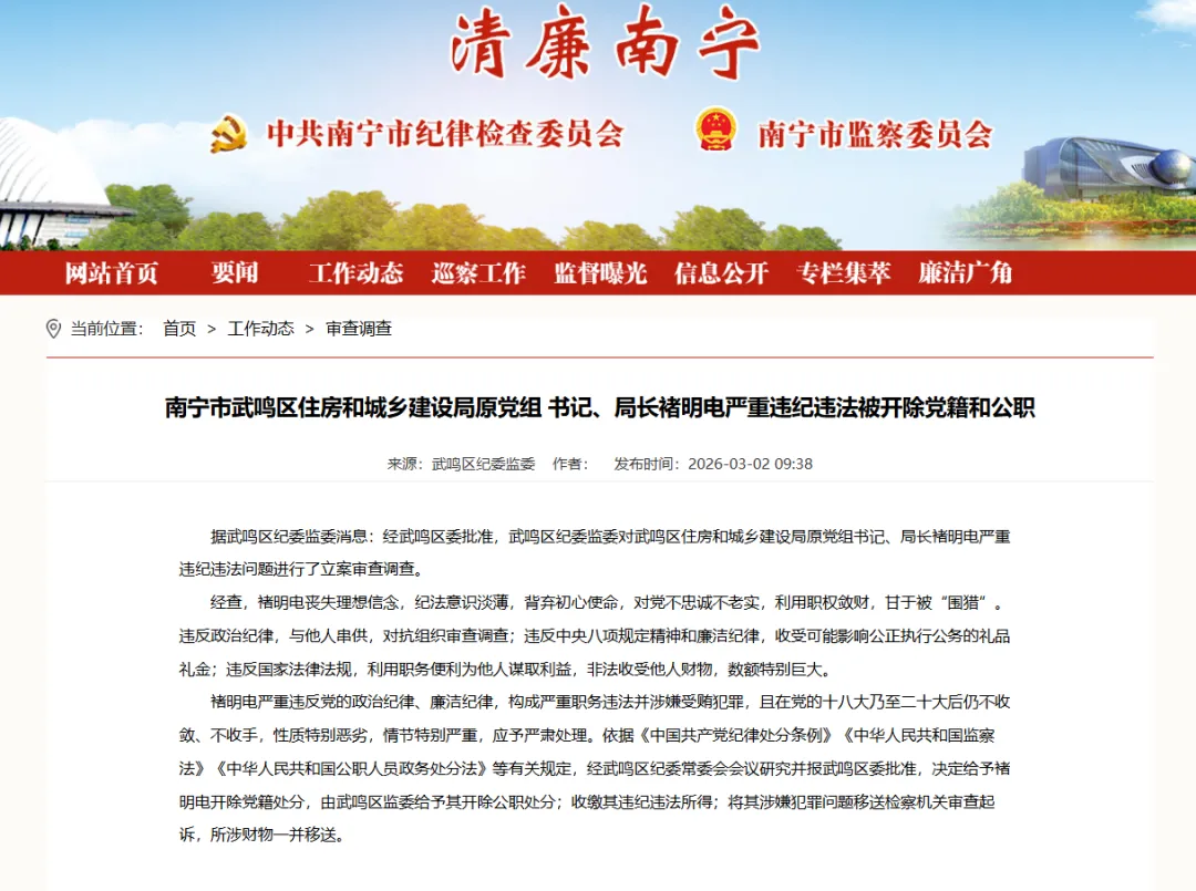 南宁市武鸣区住房和城乡建设局原党组书记、局长褚明电严重违纪违法被开除党籍和公职