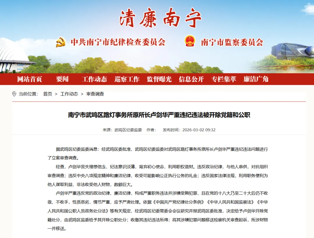 南宁市武鸣区路灯事务所原所长卢剑华严重违纪违法被开除党籍和公职