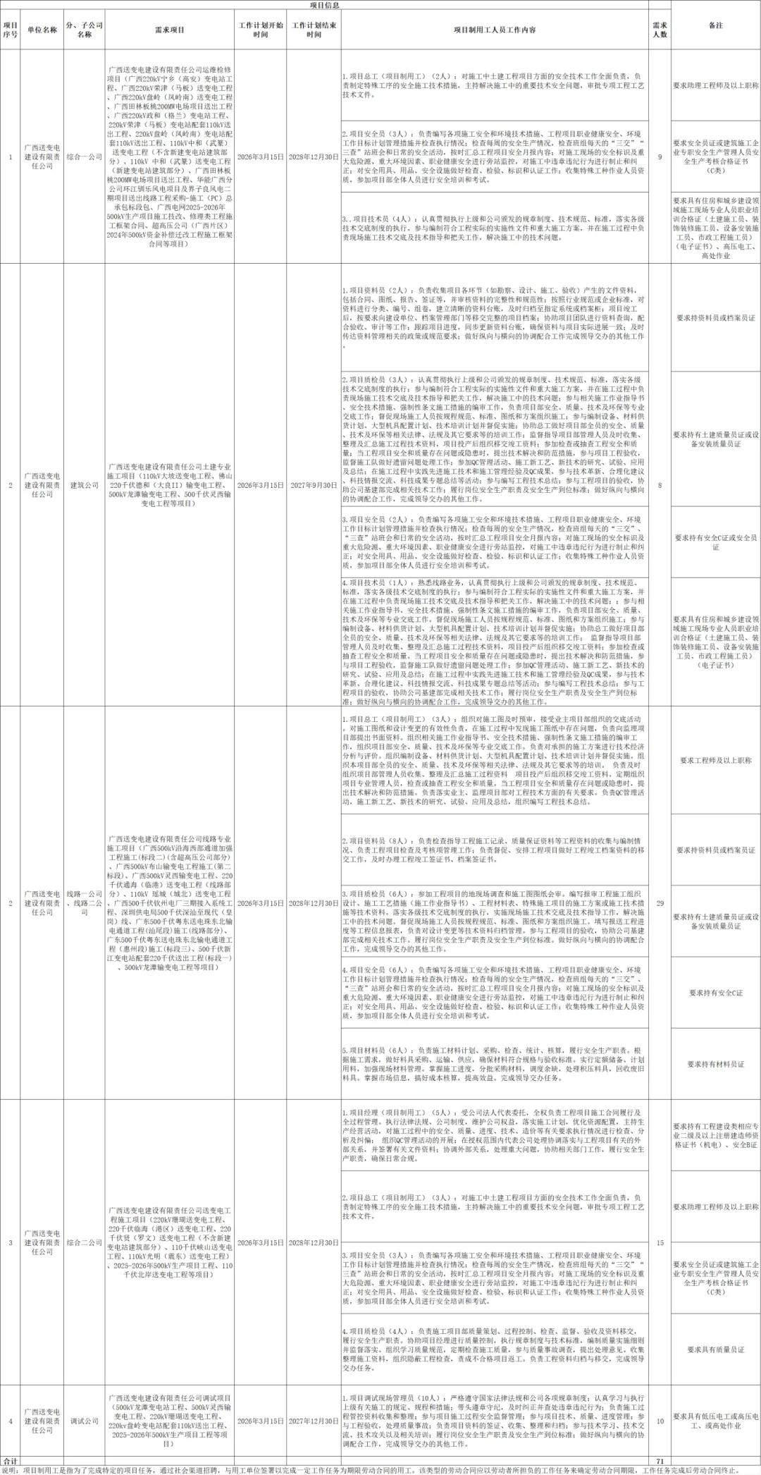 具体需求项目及岗位详见广西送变电建设有限责任公司项目制用工招聘岗位情况表。