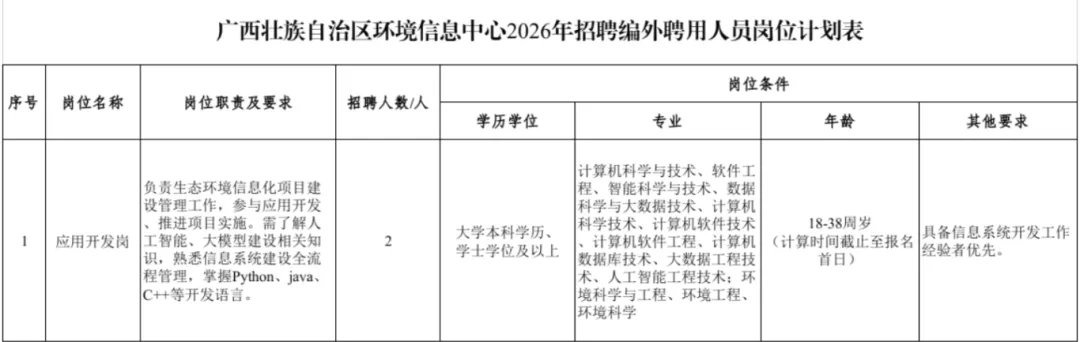 本次招聘应用开发岗编外聘用人员2名,岗位要求详见信息中心2026年招聘编外聘用人员岗位计划表。