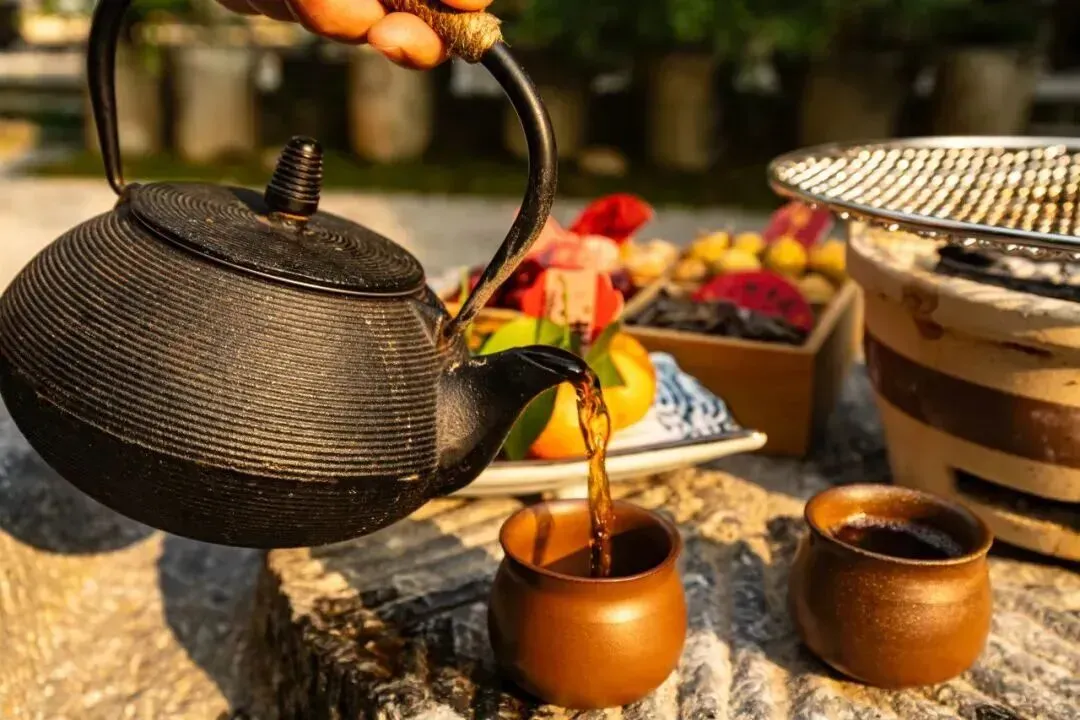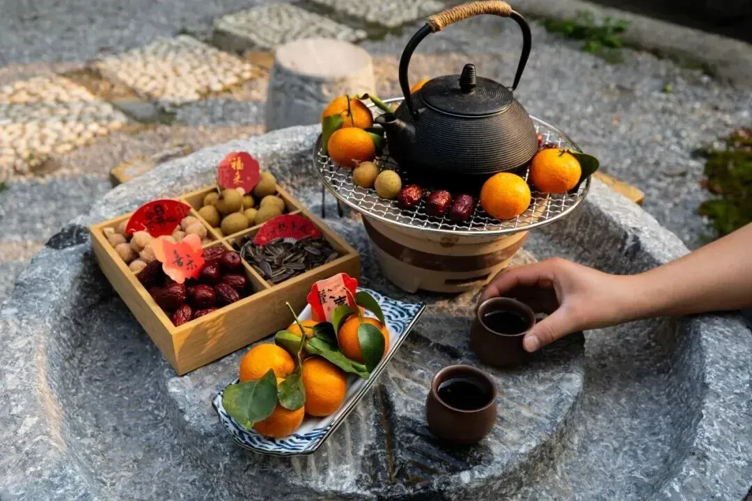 在匠园深处的咖啡馆或湖畔茶寮,一炉炭火正红。铁丝网架上,橘子烤出焦香,红枣微微爆开,茶壶里的六堡茶茶咕嘟咕嘟冒着热气。