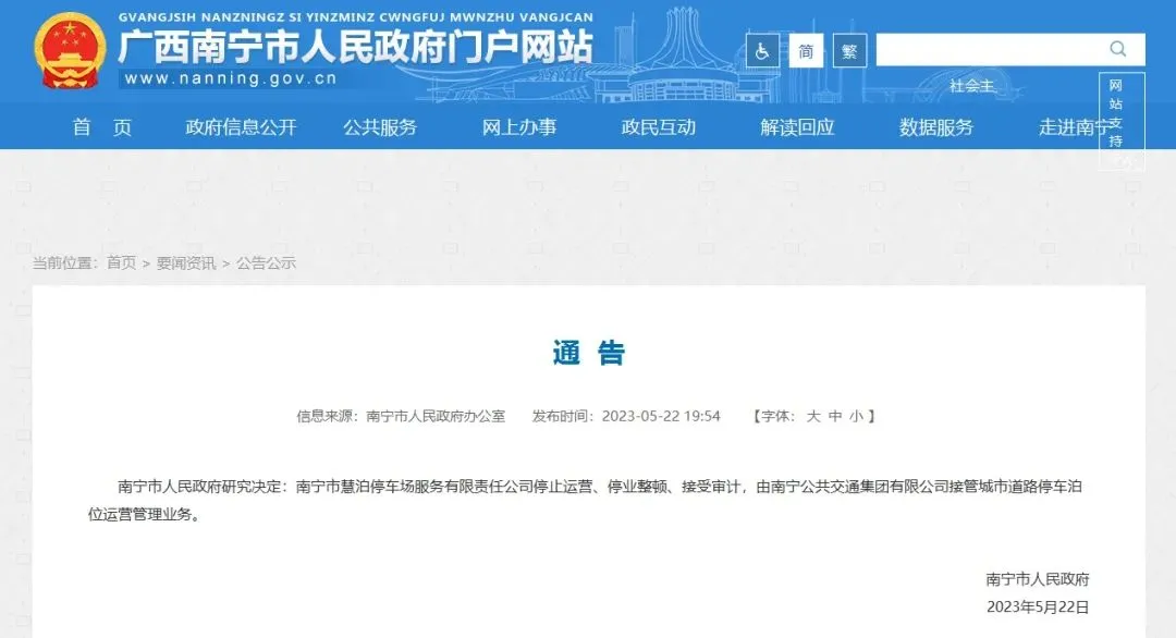 当天,南宁市人民政府发布通告,南宁市慧泊停车场服务有限责任公司停止运营、停业整顿、接受审计,由南宁公共交通集团有限公司接管城市道路停车泊位运营管理业务。