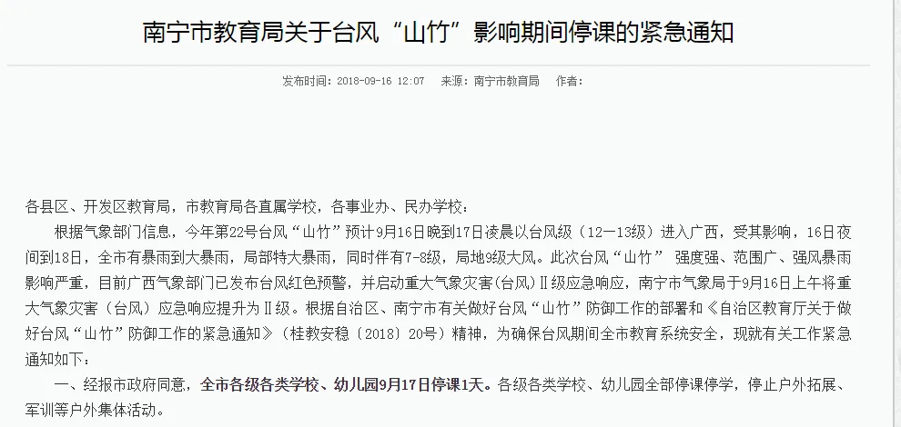 记者了解到,受台风“山竹”影响,9月17日,南宁市各级中小学校、幼儿园将停课一天。