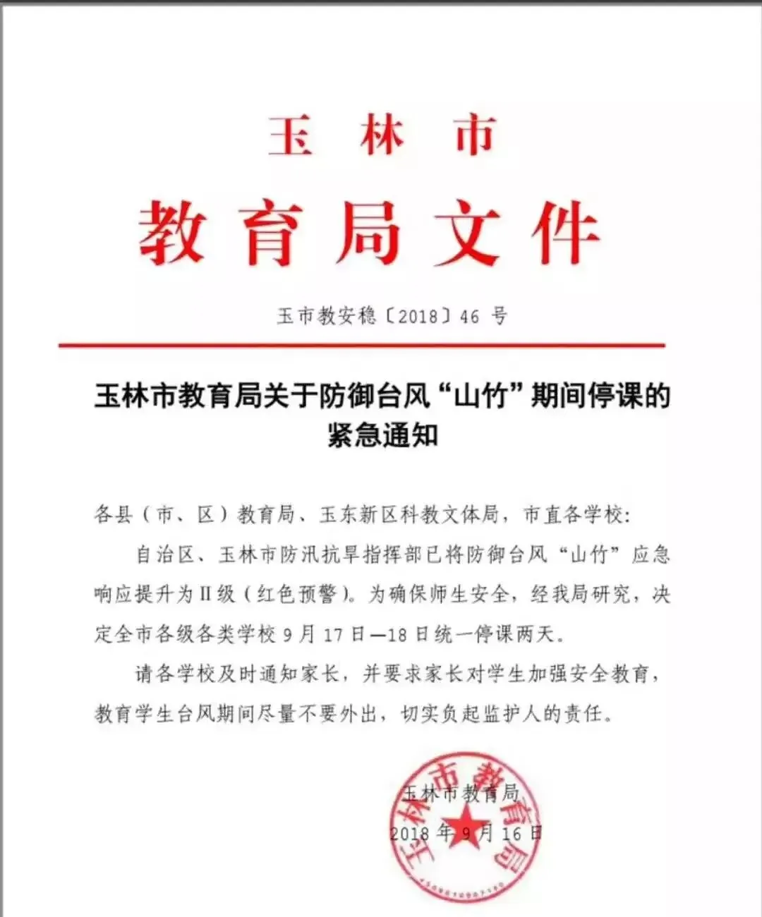 9月17日~18日,玉林市各级各类学校统一停课两天。