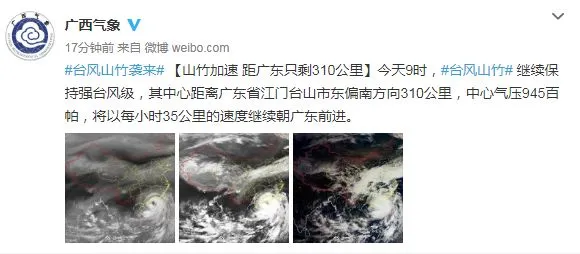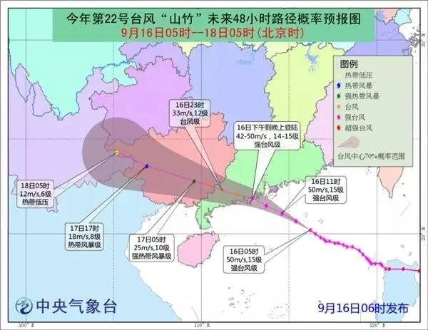 预计,“山竹”将于16日下午到晚上在广东珠海到吴川一带沿海登陆(14-15级,42-50米/秒,强台风级),登陆后将继续向西偏北方向移动,强度逐渐减弱。