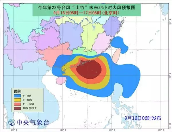 大风预报:16日08时至17日08时,南海中北部、台湾海峡、巴士海峡、琼州海峡、北部湾、福建沿海、广东沿海及广东中南部、珠江口、香港、澳门、海南岛东部和北部沿海、广西东部及沿海将有7-10级大风,阵风11-12级;其中南海北部、广东大部沿海、珠江口、香港、澳门将有11-13级大风,阵风14-15级,“山竹”中心经过的附近海面或地区风力可达14-15级,阵风16-17级。