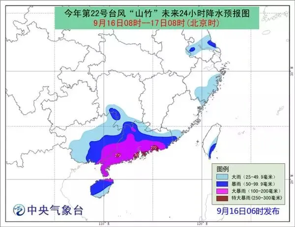 降水预报:16日08时至17日08时,广东、香港、澳门、福建东南部、广西大部、海南岛及台湾岛东南部等地有大到暴雨,其中,广东中南部、香港、澳门、广西东南部及海南岛东北部等地的部分地区有大暴雨,局地有特大暴雨。