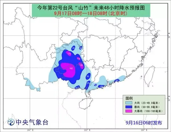 9月17日08时至18日08时,广西、贵州、云南东部及广东沿海、香港、澳门等地有大到暴雨,其中,广西西部、贵州中南部等地的部分地区有大暴雨。