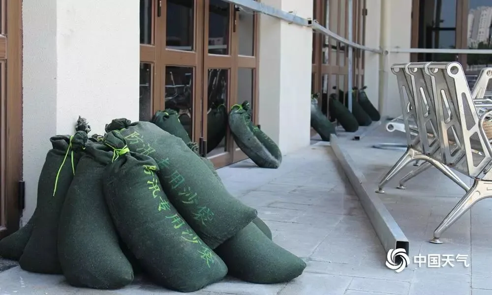 9月15日,北海国际客运港码头用防汛专用沙袋稳住玻璃门窗。