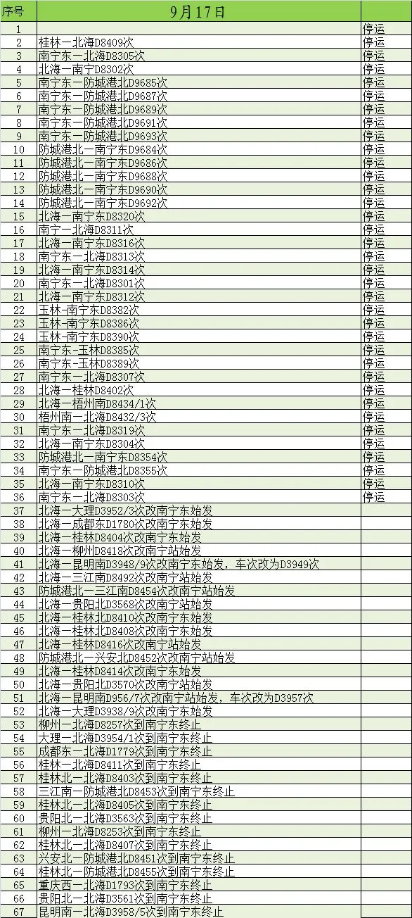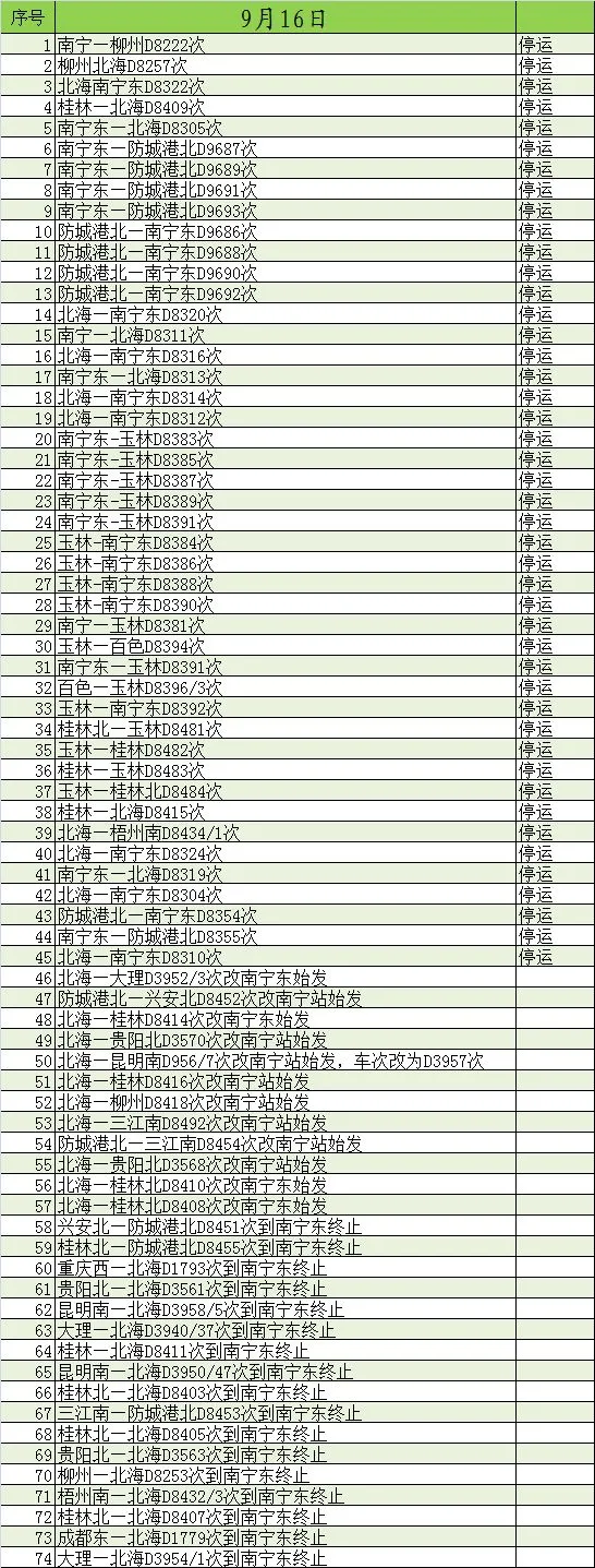 受今年22号强台风“山竹”登陆影响,9月16日,经由贵广、南广高铁进出广东的跨省高铁动车全部临时停运,经广西进出广东的普速列车临时停运。区内动车方面,9月16日有74趟动车临时停运或临时变更区段运行,9月17日有67趟动车临时停运或临时变更区段。