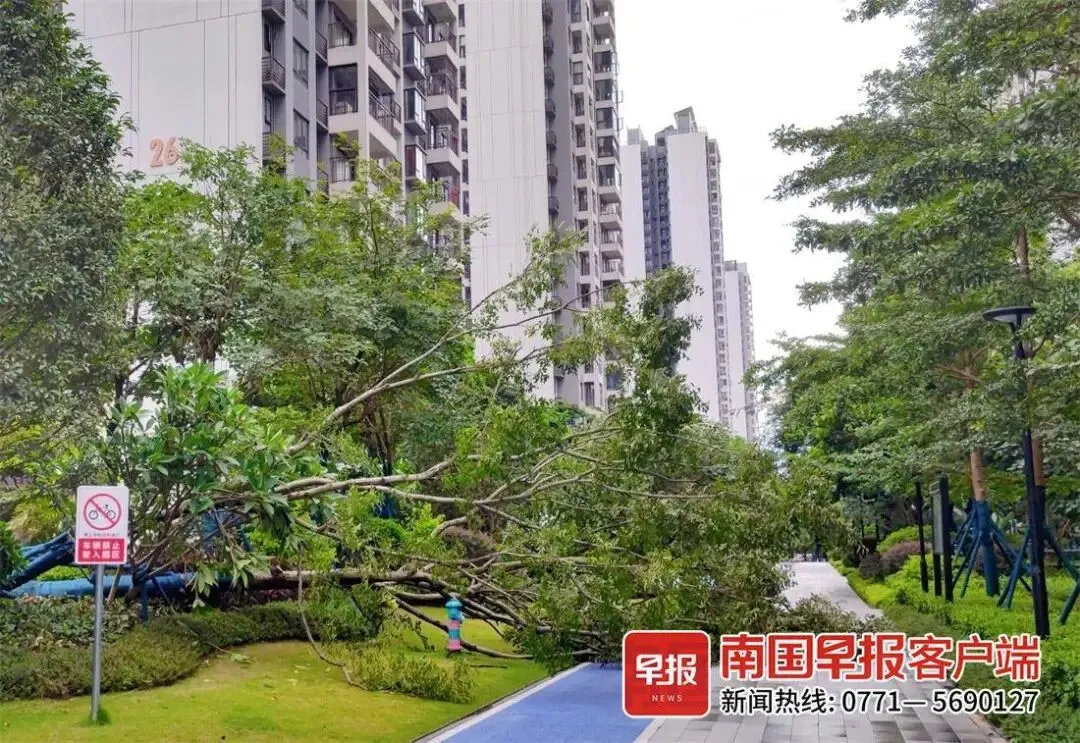 ▲6月27日中午,南宁突降大雨,大风将一小区的树木吹倒。南国早报全媒体记者 陈诗圆摄