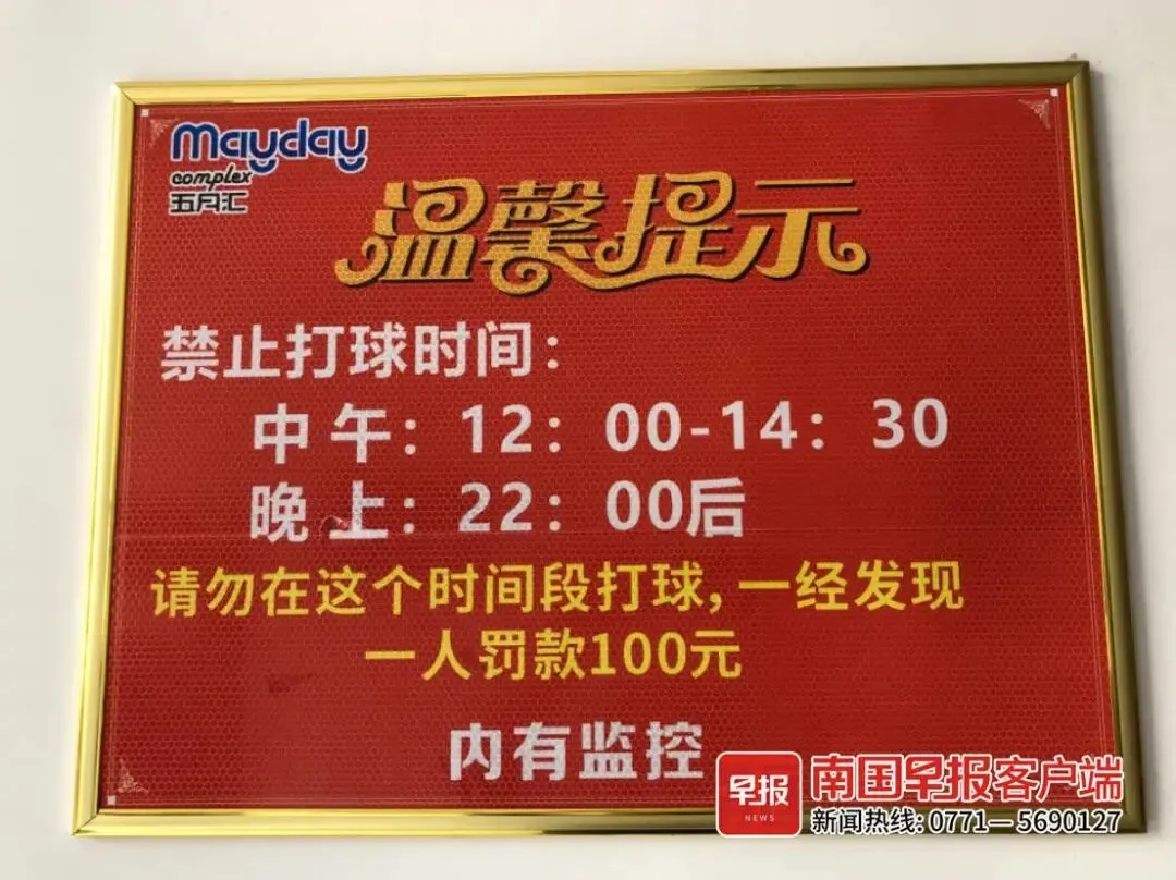 ▲五月天商贸城楼顶运动场张贴的打球时间提示。南国早报记者 程浩楠摄
