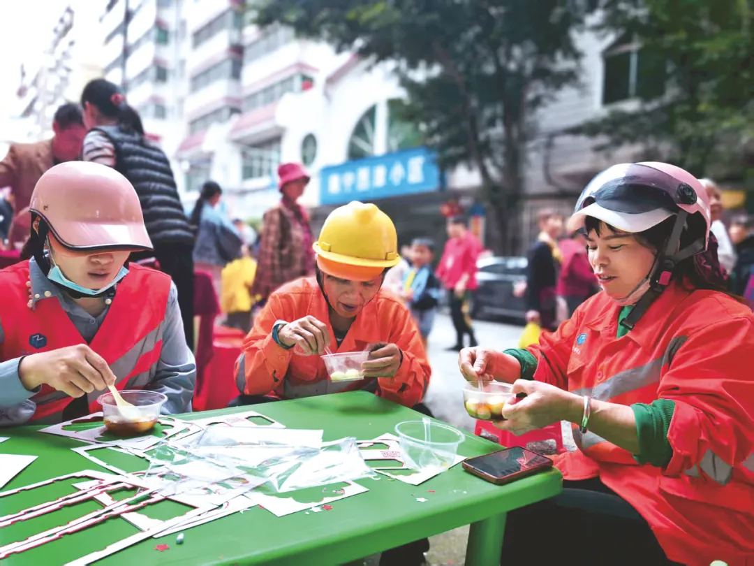 一碗汤圆甜入心,邻里围坐一家亲。活动现场暖意融融、香气扑鼻。在暖心美食区里,志愿者精心煮制香甜汤圆与热乎汤面,居民围坐在一起,品尝美食,闲话家常,邻里间的心拉得更近了。