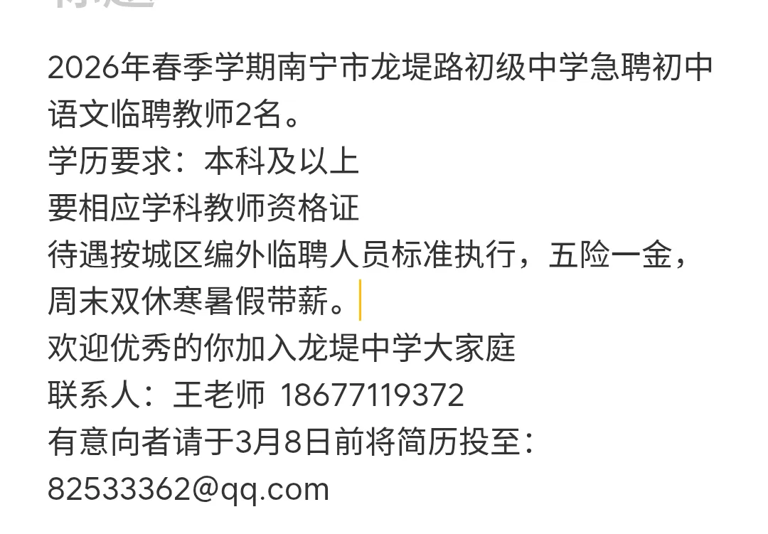 当前位置:首页>防城港>南宁教师招聘 | 南宁市龙堤路初级中学急聘