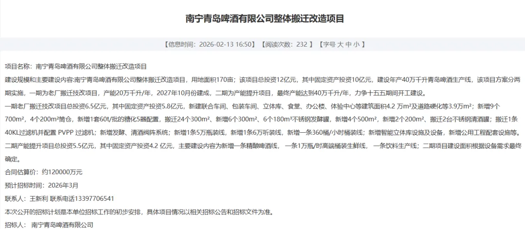 公告显示,南宁青岛啤酒有限公司(以下简称南宁青岛啤酒厂)将整体搬迁改造,用地面积170亩,项目总投资12亿元。