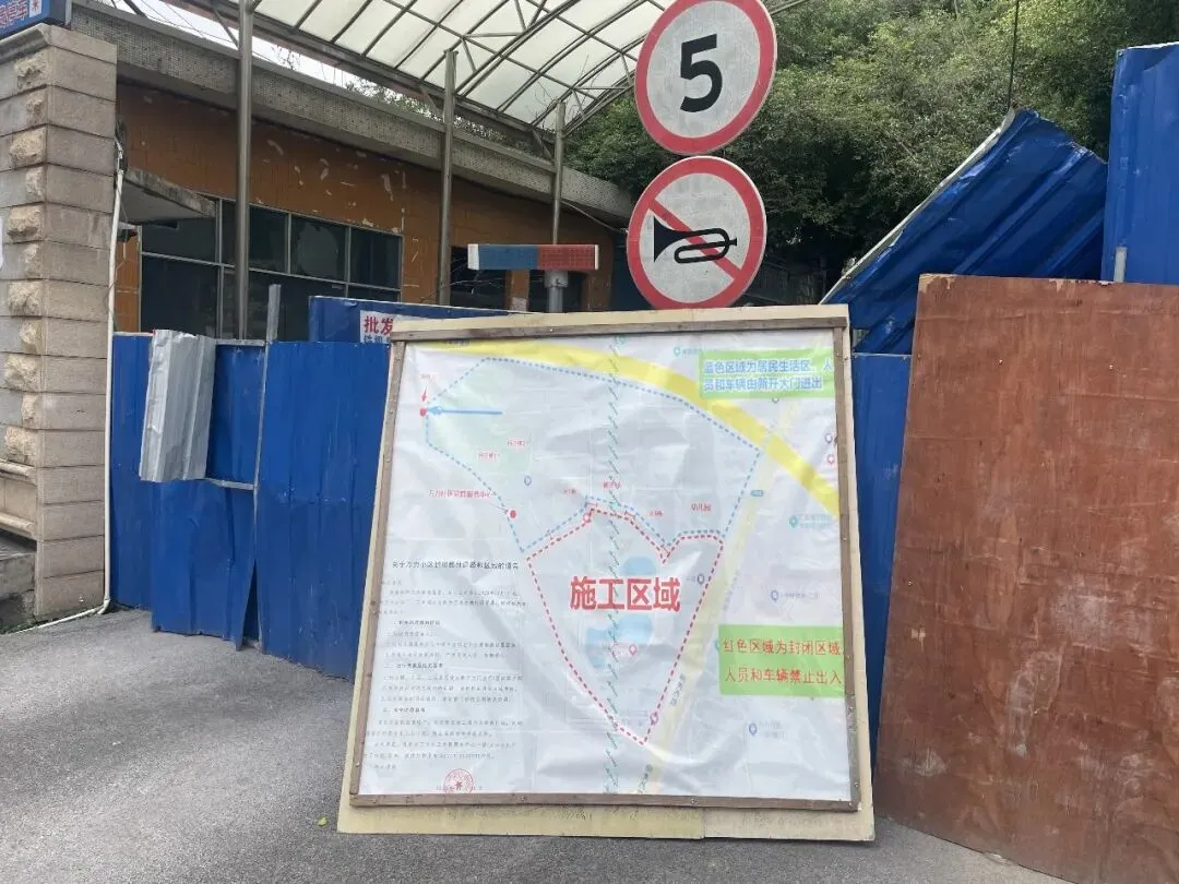 大门外围还放置了施工区域范围,以及标记居民新的出入口。