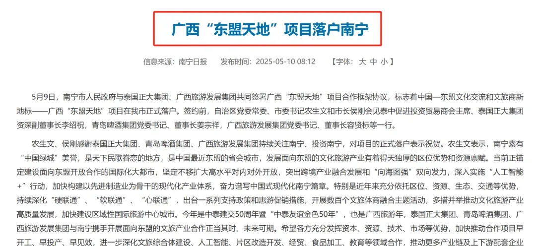 去年5月9日,南宁市人民政府正式与泰国正大集团、广西旅游发展集团共同签署广西“东盟天地”项目合作框架协议。