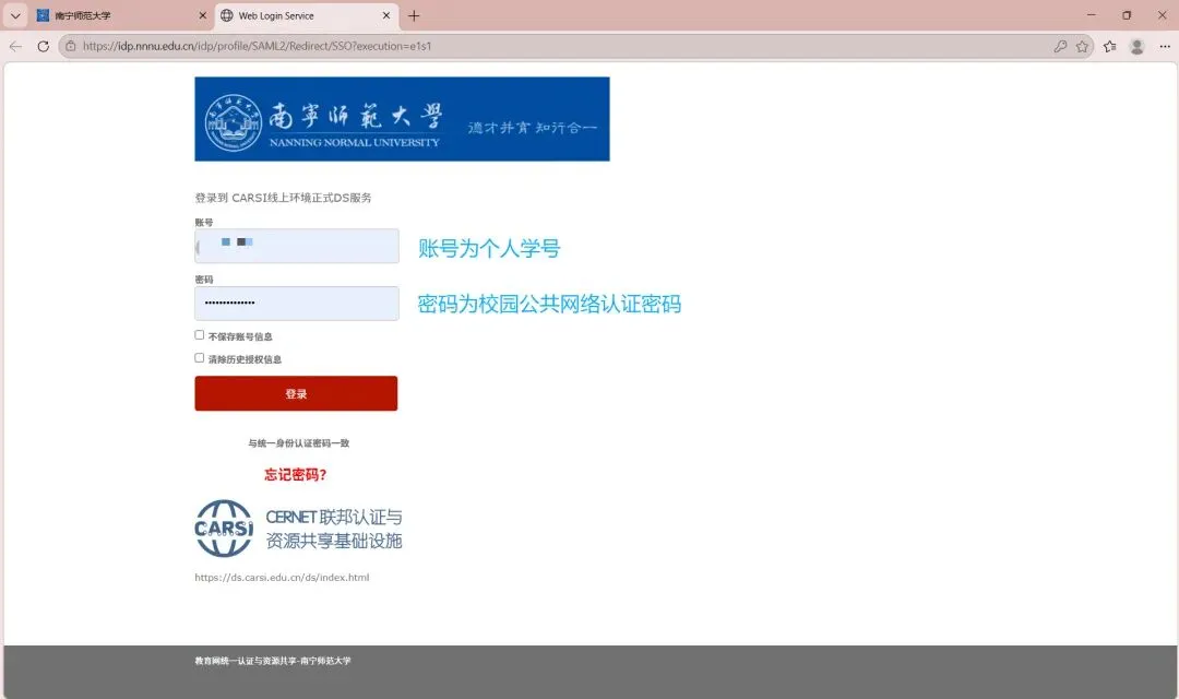 Step3:登入CARSI平台,账号为本人学号,密码为统一身份验证密码(校园办公网密码)