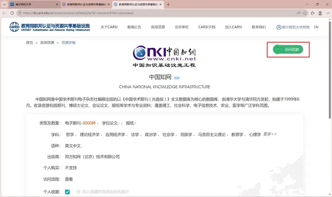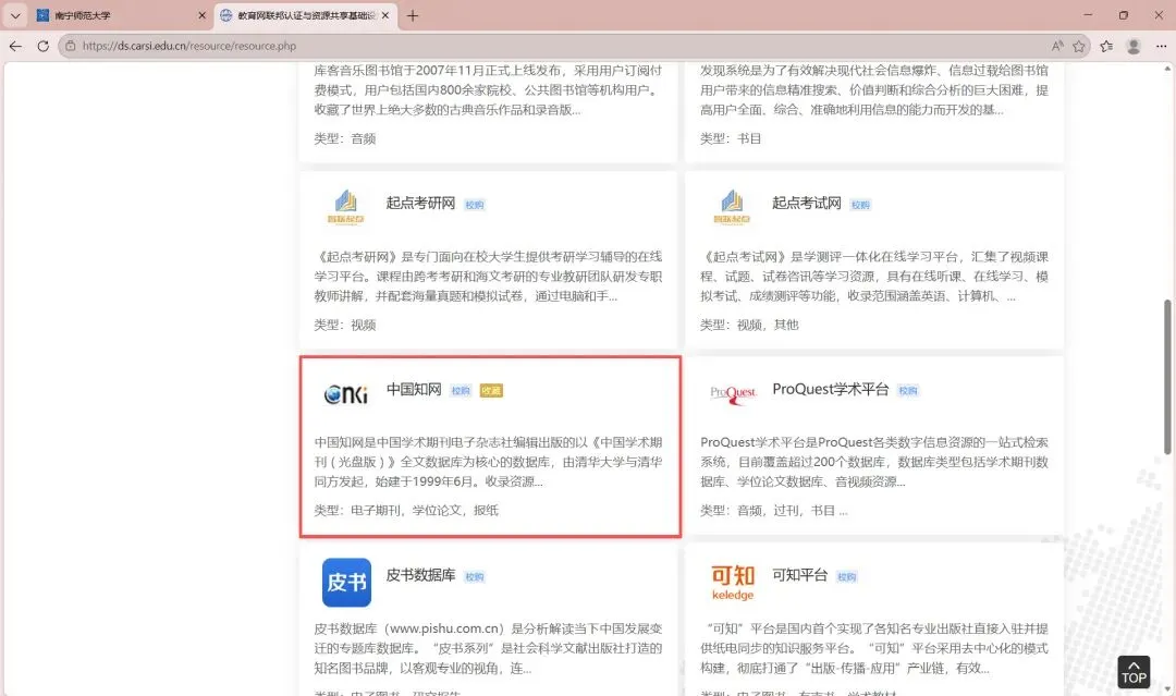 Step4:登入平台后可见校购多类资源,可根据自身需求进行选择使用,下拉可找到中国知网,点击进入中国知网页面,访问资源