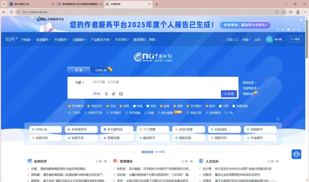 Step5:当右上角出现南宁师范大学机构标识时代表校购资源登陆成功,这时候请尽情开启你的学术探秘吧! 关注本科生学术研究,希望每一位南师学子都能找到自己的学术角落!