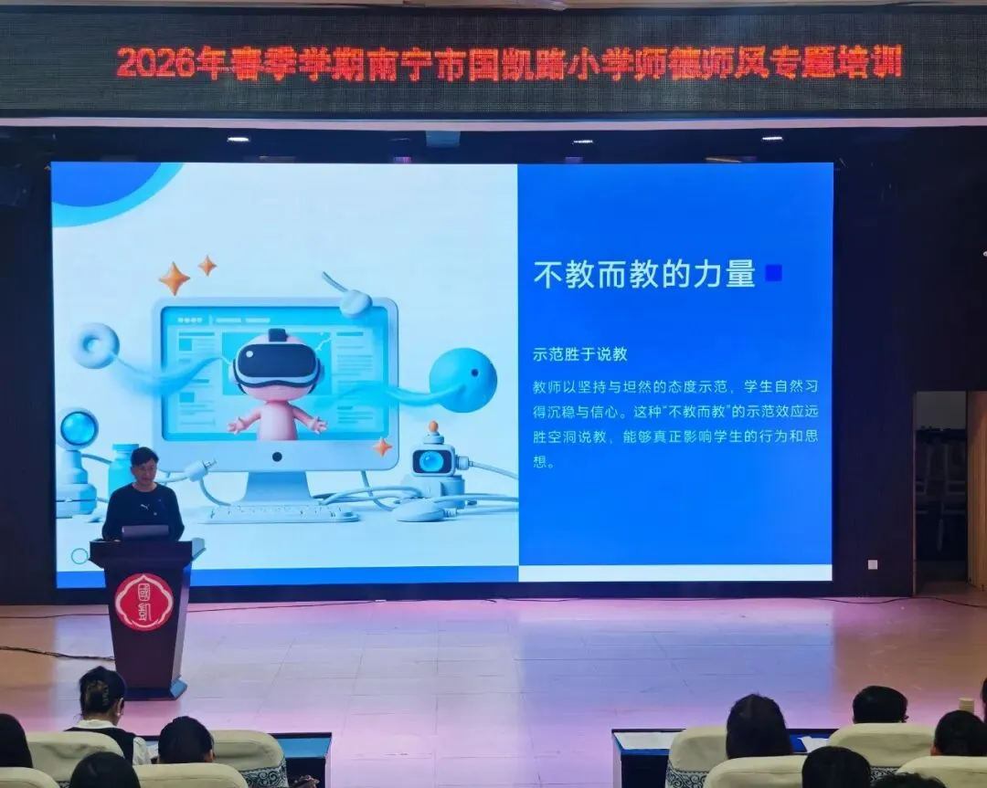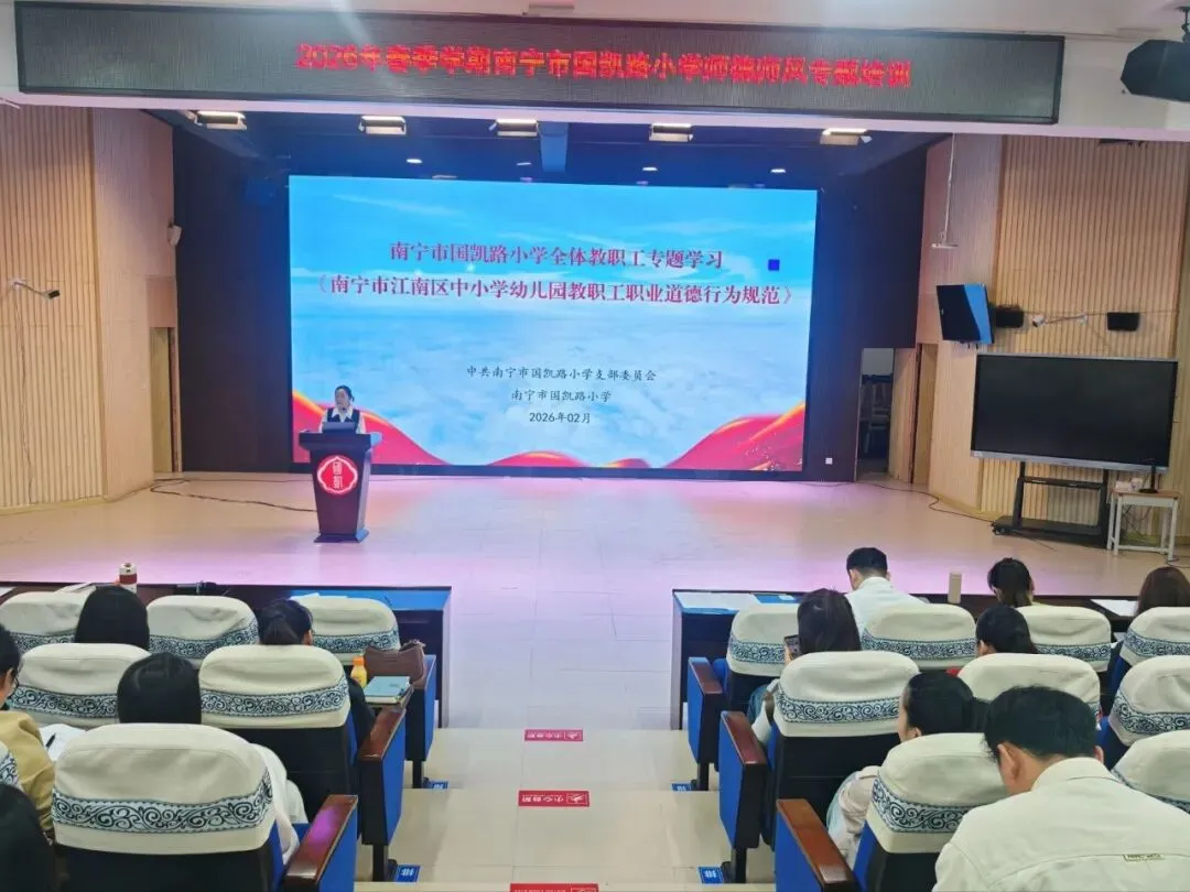 潘丽华副校长肯定了梁荣庆老师的分享真挚动人、内涵深刻,生动诠释了新时代人民教师的责任与担当,接着组织全体教职工学习《南宁市江南区中小学幼儿园教职工职业道德行为规范》,带领大家逐章逐条研读细则,明确职业行为红线与底线。结合教育教学实际案例展开研讨,引导教职工将规范要求内化于心、外化于行。教育是一场温暖的修行,师德是教师立身之本、育人之基。潘副校长强调全体教职工要以此次分享会为契机,在教书育人的道路上不断修行、不断成长,共同书写学校教育高质量发展的新篇章。