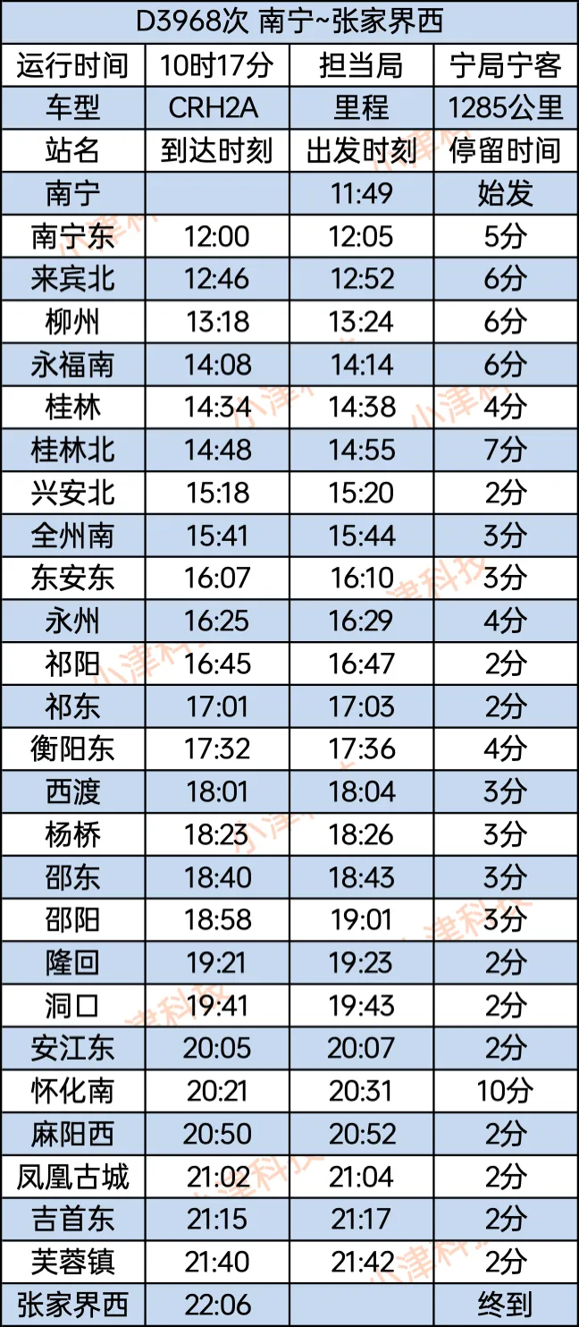 南宁站至张家界西站D3968次运行10小时17分钟,全程1285公里。南宁站11:49始发,经停南宁东、来宾北、柳州、永福南、桂林、桂林北、兴安北、全州南、东安东、永州、祁阳、祁东、衡阳东、西渡、杨桥、邵东、邵阳、隆回、洞口、安江东、怀化南、麻阳西、凤凰古城、吉首东、芙蓉镇,22:06终到张家界西站。