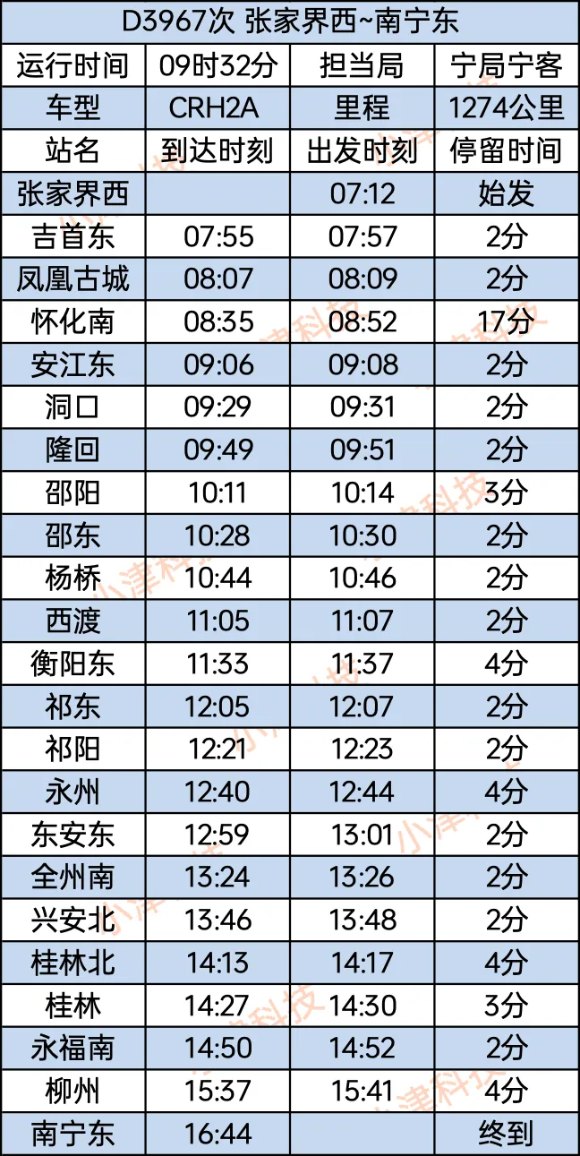 张家界西站至南宁东站D3967次运行9小时32分钟,全程1274公里。张家界西站7:12始发,经停吉首东站、凤凰东站、怀化南站、安江东、洞口、隆回、邵阳、邵东、杨桥、西渡、衡阳东站、祁东、祁阳、永州、东安东站、全州南站、兴安北站、桂林北站、桂林、永福南、鹿寨北、柳州,16:44终到南宁东。