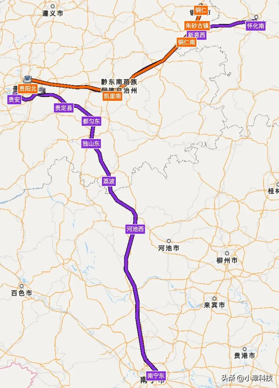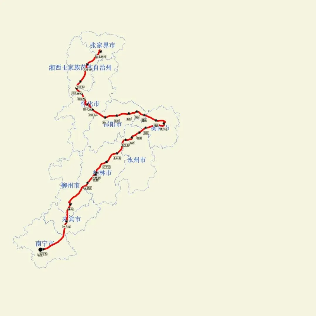 目前有南宁走贵阳至铜仁南的高铁,即贵南高铁-沪昆高铁-铜玉铁路,其实也可以这么走,但是绕行比上述怀桂高铁更麻烦,首先要去贵阳绕一个大圈,然后到铜仁就没有铁路了。如果在沪昆高铁怀化南站北上则需要在怀化南站换向,耽误车站运行效率。