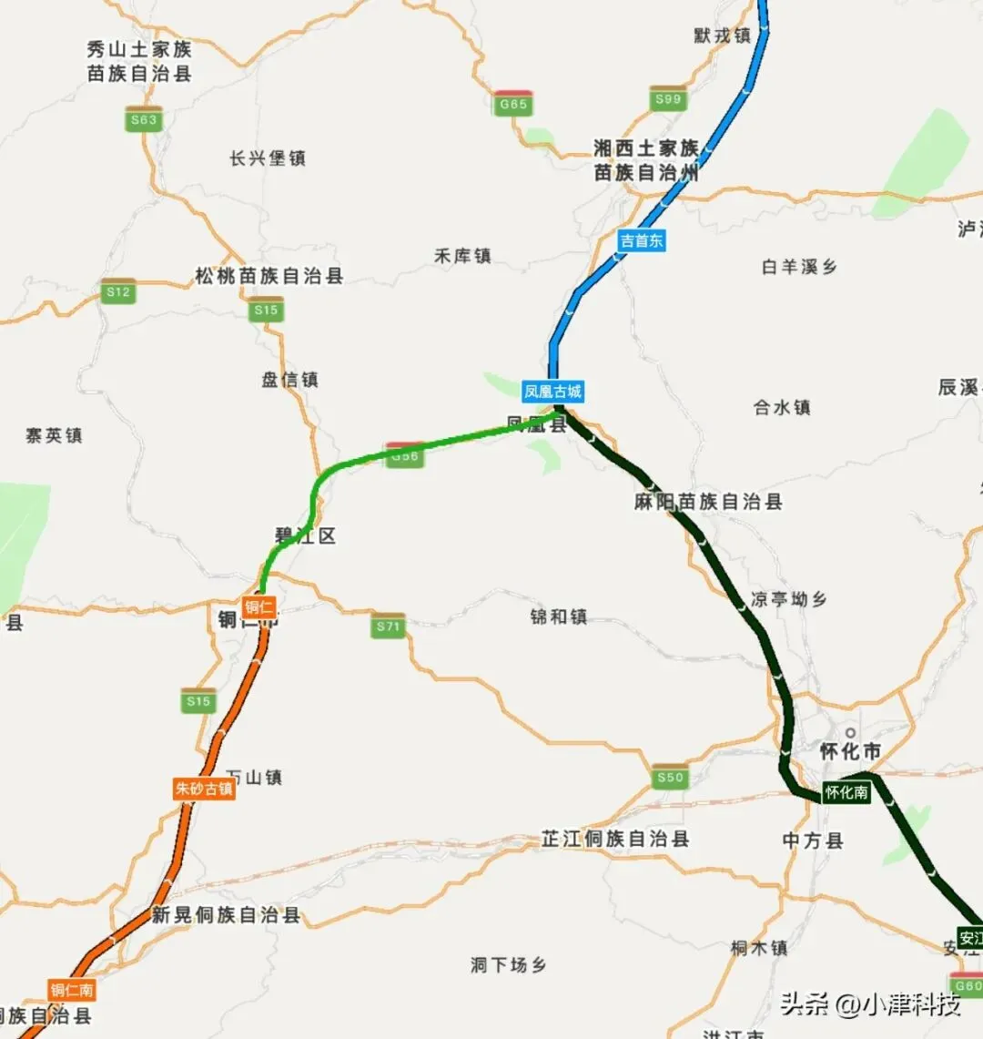 可能的方案,都匀东-凯里南站建设联络线,即都凯城际铁路,联络贵南高铁和沪昆高铁,目前没有开工建设。然后是设计时速为250公里的铜仁-吉首的铜吉铁路,目前贵州段已开工,设铜仁、铜仁北、凤凰古城3座车站,在凤凰古城站接入张怀吉高铁北上到张家界。这两段加起来是理想的方案了。
