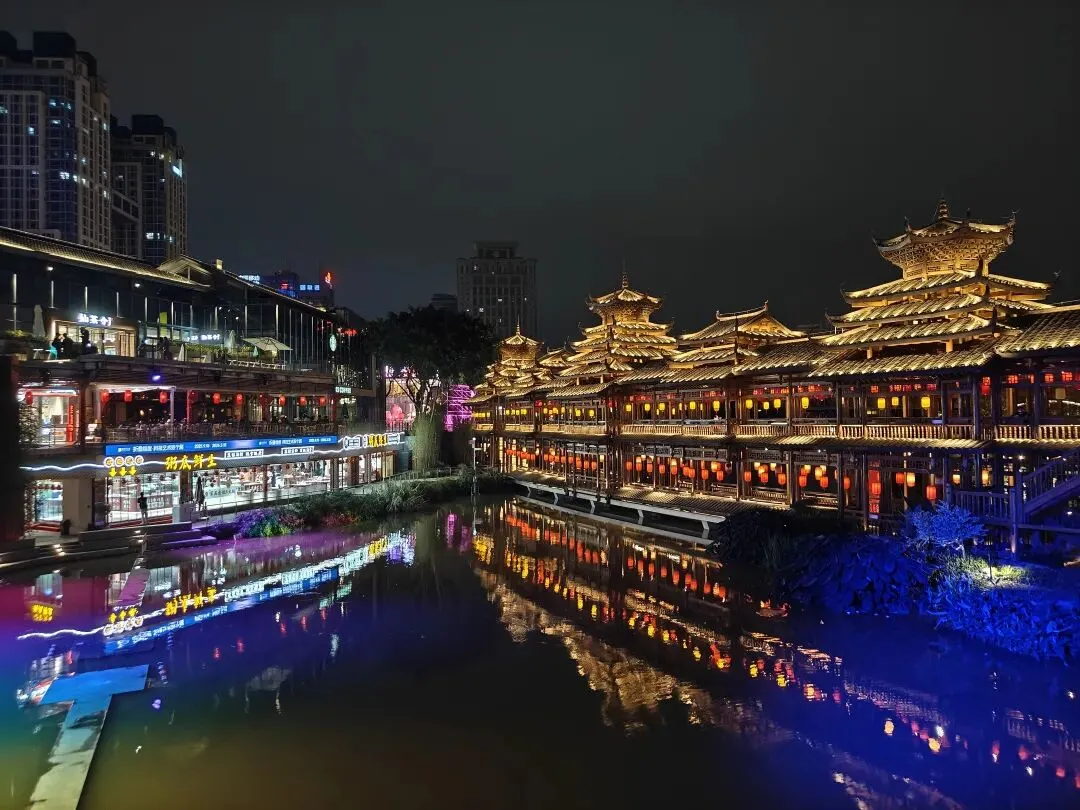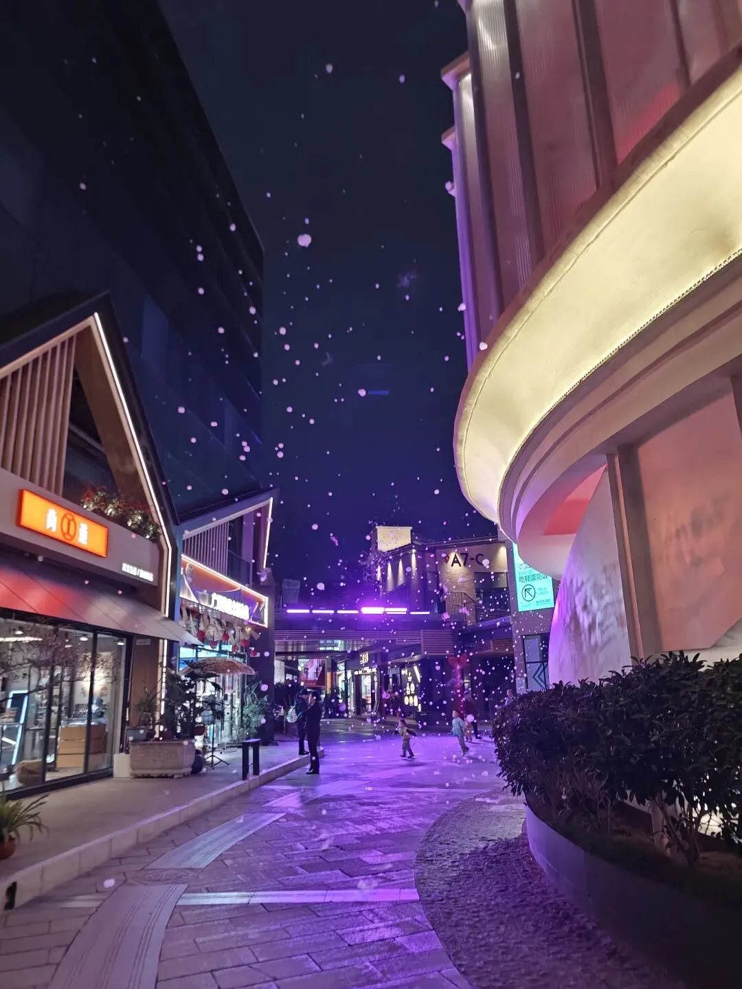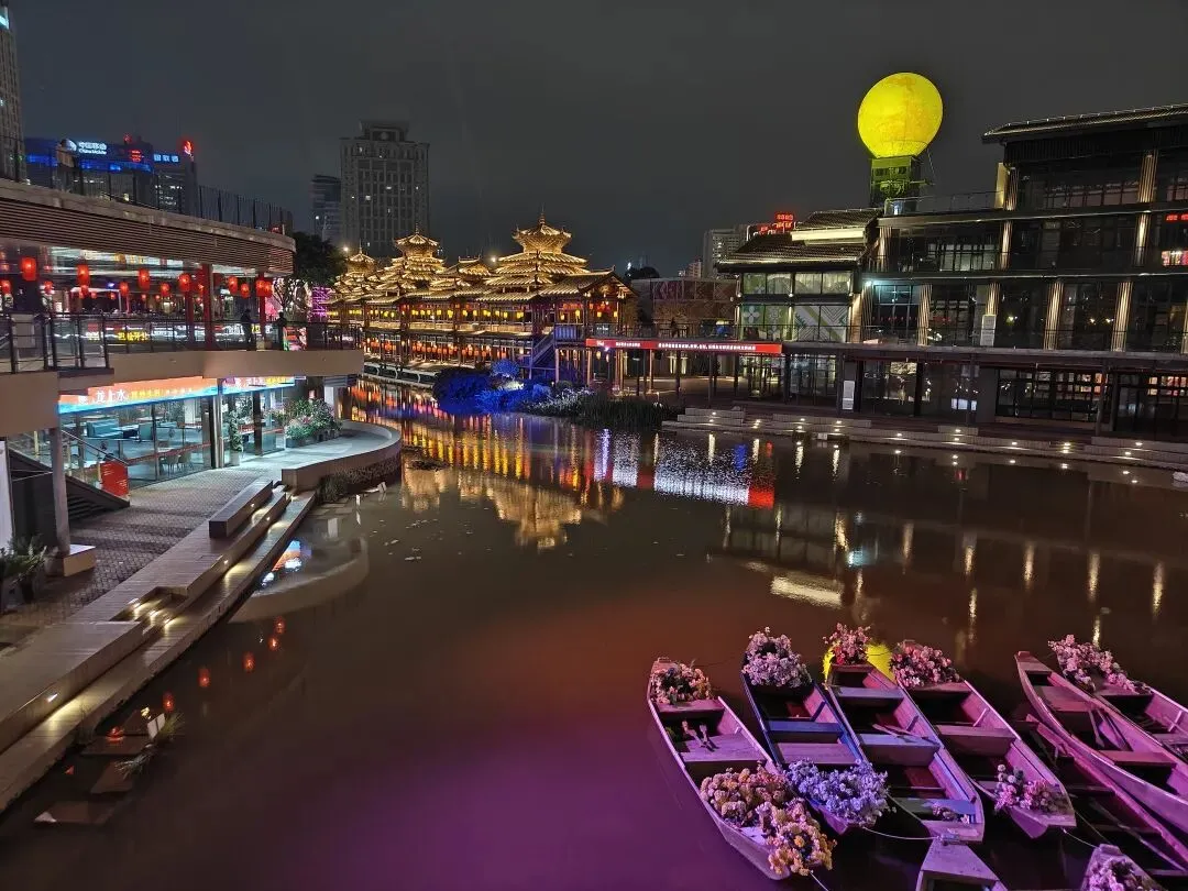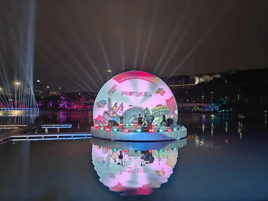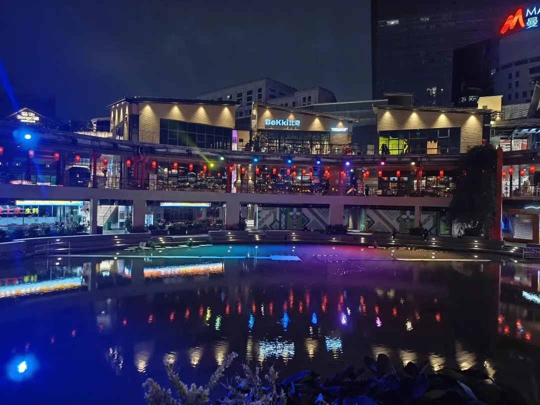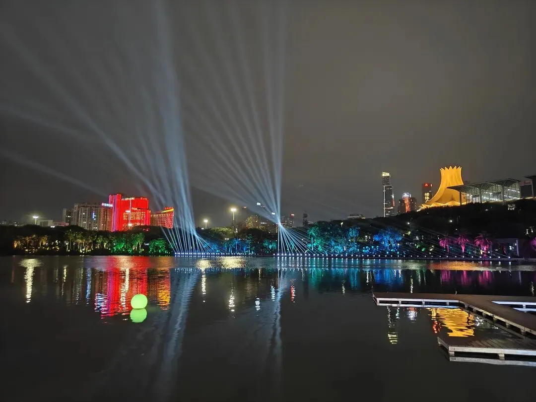 晚上聊得很开心,因为想要去看民歌湖夜景,在9点钟,我只能匆匆离席。很可惜高德地图定位的民歌湖,下车后我一脸懵,怎么看也不像是我要去的地方,导航再定位一下,提醒我已经到达目的地。只能发挥我传统问路的本领了。一位小哥哥告诉我就在前面不远。我走啊走,一位大哥哥告诉我就在前面不远,我走那么快,几分钟就能到。我于是又走啊走,有一位小哥哥告诉我,前面很快就到了。好吧,我再走啊走,总共应该走了最少1公里,终于是到了。我才发现,我应该定位的是民歌湖国际音乐小镇。相较于南宁中心城区的喧闹,音乐小镇多少显得有点冷清,炫目的灯光幻化映照着各种美景,很是出片,各个演出团体前稀稀落落的人们。匆匆拍了几张照,已经是晚上10点多了,天空下起了雨,一切都是最好的安排,只是感叹:匆匆太匆匆!